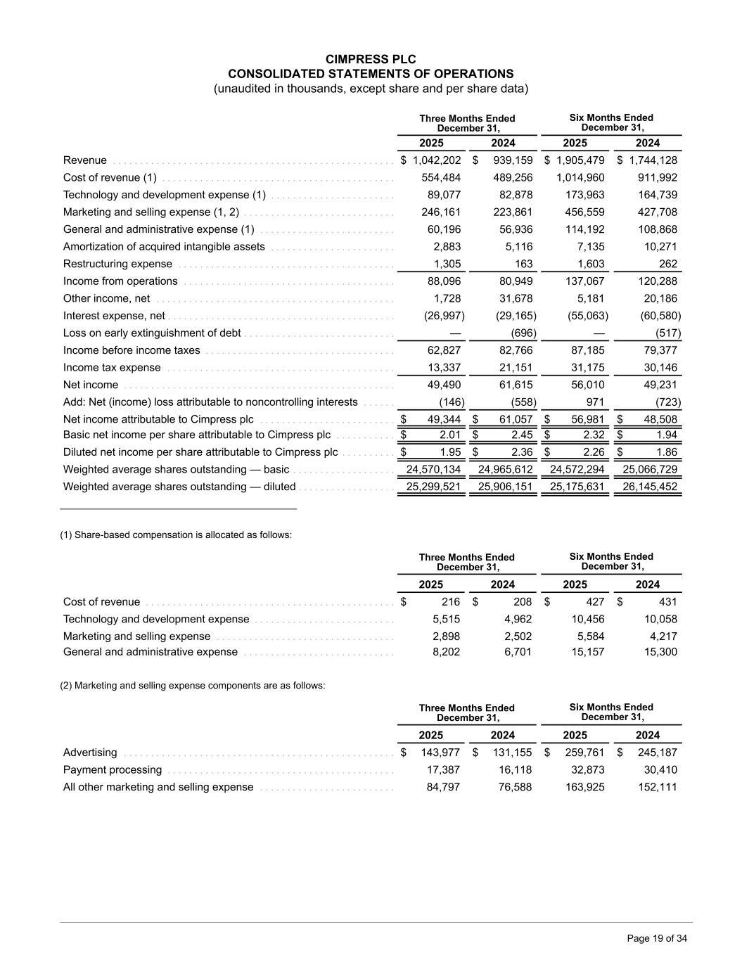 CIMPRESS PLC CONSOLIDATED STATEMENTS OF OPERATIONS (unaudited in thousands, except share and per share data) Three Months Ended December 31, Six Months Ended December 31, 2025 2024 2025 2024 Revenue . . . . . . . . . . . . . . . . . . . . . . . . . . . . . . . . . . . . . . . . . . . . . . . . . . . . $ 1,042,202 $ 939,159 $ 1,905,479 $ 1,744,128 Cost of revenue (1) . . . . . . . . . . . . . . . . . . . . . . . . . . . . . . . . . . . . . . . . . . . 554,484 489,256 1,014,960 911,992 Technology and development expense (1) . . . . . . . . . . . . . . . . . . . . . . . 89,077 82,878 173,963 164,739 Marketing and selling expense (1, 2) . . . . . . . . . . . . . . . . . . . . . . . . . . . . 246,161 223,861 456,559 427,708 General and administrative expense (1) . . . . . . . . . . . . . . . . . . . . . . . . . 60,196 56,936 114,192 108,868 Amortization of acquired intangible assets . . . . . . . . . . . . . . . . . . . . . . . 2,883 5,116 7,135 10,271 Restructuring expense . . . . . . . . . . . . . . . . . . . . . . . . . . . . . . . . . . . . . . . . 1,305 163 1,603 262 Income from operations . . . . . . . . . . . . . . . . . . . . . . . . . . . . . . . . . . . . . . . 88,096 80,949 137,067 120,288 Other income, net . . . . . . . . . . . . . . . . . . . . . . . . . . . . . . . . . . . . . . . . . . . . 1,728 31,678 5,181 20,186 Interest expense, net . . . . . . . . . . . . . . . . . . . . . . . . . . . . . . . . . . . . . . . . . . (26,997) (29,165) (55,063) (60,580) Loss on early extinguishment of debt . . . . . . . . . . . . . . . . . . . . . . . . . . . . — (696) — (517) Income before income taxes . . . . . . . . . . . . . . . . . . . . . . . . . . . . . . . . . . . 62,827 82,766 87,185 79,377 Income tax expense . . . . . . . . . . . . . . . . . . . . . . . . . . . . . . . . . . . . . . . . . . 13,337 21,151 31,175 30,146 Net income . . . . . . . . . . . . . . . . . . . . . . . . . . . . . . . . . . . . . . . . . . . . . . . . . . 49,490 61,615 56,010 49,231 Add: Net (income) loss attributable to noncontrolling interests . . . . . . (146) (558) 971 (723) Net income attributable to Cimpress plc . . . . . . . . . . . . . . . . . . . . . . . . . $ 49,344 $ 61,057 $ 56,981 $ 48,508 Basic net income per share attributable to Cimpress plc . . . . . . . . . . . $ 2.01 $ 2.45 $ 2.32 $ 1.94 Diluted net income per share attributable to Cimpress plc . . . . . . . . . . $ 1.95 $ 2.36 $ 2.26 $ 1.86 Weighted average shares outstanding — basic . . . . . . . . . . . . . . . . . . . 24,570,134 24,965,612 24,572,294 25,066,729 Weighted average shares outstanding — diluted . . . . . . . . . . . . . . . . . . 25,299,521 25,906,151 25,175,631 26,145,452 ____________________________________________ (1) Share-based compensation is allocated as follows: Three Months Ended December 31, Six Months Ended December 31, 2025 2024 2025 2024 Cost of revenue . . . . . . . . . . . . . . . . . . . . . . . . . . . . . . . . . . . . . . . . . . . . . . $ 216 $ 208 $ 427 $ 431 Technology and development expense . . . . . . . . . . . . . . . . . . . . . . . . . . 5,515 4,962 10,456 10,058 Marketing and selling expense . . . . . . . . . . . . . . . . . . . . . . . . . . . . . . . . . 2,898 2,502 5,584 4,217 General and administrative expense . . . . . . . . . . . . . . . . . . . . . . . . . . . . 8,202 6,701 15,157 15,300 (2) Marketing and selling expense components are as follows: Three Months Ended December 31, Six Months Ended December 31, 2025 2024 2025 2024 Advertising . . . . . . . . . . . . . . . . . . . . . . . . . . . . . . . . . . . . . . . . . . . . . . . . . . $ 143,977 $ 131,155 $ 259,761 $ 245,187 Payment processing . . . . . . . . . . . . . . . . . . . . . . . . . . . . . . . . . . . . . . . . . . 17,387 16,118 32,873 30,410 All other marketing and selling expense . . . . . . . . . . . . . . . . . . . . . . . . . 84,797 76,588 163,925 152,111 Page 19 of 34
