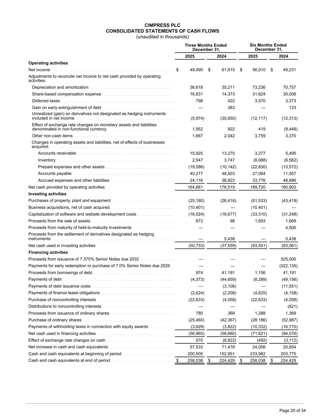 CIMPRESS PLC CONSOLIDATED STATEMENTS OF CASH FLOWS (unaudited in thousands) Three Months Ended December 31, Six Months Ended December 31, 2025 2024 2025 2024 Operating activities Net income . . . . . . . . . . . . . . . . . . . . . . . . . . . . . . . . . . . . . . . . . . . . . . . . . . . . . . . . . . $ 49,490 $ 61,615 $ 56,010 $ 49,231 Adjustments to reconcile net income to net cash provided by operating activities: Depreciation and amortization . . . . . . . . . . . . . . . . . . . . . . . . . . . . . . . . . . . . . . . . 36,618 35,211 73,236 70,757 Share-based compensation expense . . . . . . . . . . . . . . . . . . . . . . . . . . . . . . . . . . 16,831 14,373 31,624 30,006 Deferred taxes . . . . . . . . . . . . . . . . . . . . . . . . . . . . . . . . . . . . . . . . . . . . . . . . . . . . . 798 422 3,570 3,373 Gain on early extinguishment of debt . . . . . . . . . . . . . . . . . . . . . . . . . . . . . . . . . . — 383 — 123 Unrealized (gain) on derivatives not designated as hedging instruments included in net income . . . . . . . . . . . . . . . . . . . . . . . . . . . . . . . . . . . . . . . . . . . . . . (5,974) (30,650) (12,117) (12,313) Effect of exchange rate changes on monetary assets and liabilities denominated in non-functional currency . . . . . . . . . . . . . . . . . . . . . . . . . . . . . . . 1,952 922 419 (9,448) Other non-cash items . . . . . . . . . . . . . . . . . . . . . . . . . . . . . . . . . . . . . . . . . . . . . . . 1,667 2,042 3,759 3,370 Changes in operating assets and liabilities, net of effects of businesses acquired: . . . . . . . . . . . . . . . . . . . . . . . . . . . . . . . . . . . . . . . . . . . . . . . . . . . . . . . . . . Accounts receivable . . . . . . . . . . . . . . . . . . . . . . . . . . . . . . . . . . . . . . . . . . . . . 15,925 13,270 3,277 5,495 Inventory . . . . . . . . . . . . . . . . . . . . . . . . . . . . . . . . . . . . . . . . . . . . . . . . . . . . . . . 2,547 3,747 (8,088) (6,562) Prepaid expenses and other assets . . . . . . . . . . . . . . . . . . . . . . . . . . . . . . . . (19,586) (10,142) (22,830) (13,572) Accounts payable . . . . . . . . . . . . . . . . . . . . . . . . . . . . . . . . . . . . . . . . . . . . . . . 40,277 48,503 27,084 11,557 Accrued expenses and other liabilities . . . . . . . . . . . . . . . . . . . . . . . . . . . . . . 24,116 36,823 33,776 48,886 Net cash provided by operating activities 164,661 176,519 189,720 180,903 Investing activities Purchases of property, plant and equipment . . . . . . . . . . . . . . . . . . . . . . . . . . . . . (25,180) (26,418) (51,533) (43,419) Business acquisitions, net of cash acquired . . . . . . . . . . . . . . . . . . . . . . . . . . . . . . (10,401) — (10,401) — Capitalization of software and website development costs . . . . . . . . . . . . . . . . . (16,024) (16,677) (33,310) (31,248) Proceeds from the sale of assets . . . . . . . . . . . . . . . . . . . . . . . . . . . . . . . . . . . . . . . 872 98 1,693 1,668 Proceeds from maturity of held-to-maturity investments . . . . . . . . . . . . . . . . . . . — — — 4,500 Proceeds from the settlement of derivatives designated as hedging instruments . . . . . . . . . . . . . . . . . . . . . . . . . . . . . . . . . . . . . . . . . . . . . . . . . . . . . . . . . — 5,438 — 5,438 Net cash used in investing activities (50,733) (37,559) (93,551) (63,061) Financing activities Proceeds from issuance of 7.375% Senior Notes due 2032 . . . . . . . . . . . . . . . . — — — 525,000 Payments for early redemption or purchase of 7.0% Senior Notes due 2026 . — — — (522,135) Proceeds from borrowings of debt . . . . . . . . . . . . . . . . . . . . . . . . . . . . . . . . . . . . . . 974 41,191 1,156 41,191 Payments of debt . . . . . . . . . . . . . . . . . . . . . . . . . . . . . . . . . . . . . . . . . . . . . . . . . . . . (4,373) (44,659) (8,289) (49,156) Payments of debt issuance costs . . . . . . . . . . . . . . . . . . . . . . . . . . . . . . . . . . . . . . . — (3,106) — (11,551) Payments of finance lease obligations . . . . . . . . . . . . . . . . . . . . . . . . . . . . . . . . . . (2,624) (2,208) (4,625) (4,158) Purchase of noncontrolling interests . . . . . . . . . . . . . . . . . . . . . . . . . . . . . . . . . . . . (22,633) (4,058) (22,633) (4,058) Distributions to noncontrolling interests . . . . . . . . . . . . . . . . . . . . . . . . . . . . . . . . . — — — (821) Proceeds from issuance of ordinary shares . . . . . . . . . . . . . . . . . . . . . . . . . . . . . . 780 369 1,288 1,369 Purchase of ordinary shares . . . . . . . . . . . . . . . . . . . . . . . . . . . . . . . . . . . . . . . . . . . (25,460) (42,367) (28,186) (52,987) Payments of withholding taxes in connection with equity awards . . . . . . . . . . . (3,629) (3,822) (10,332) (16,770) Net cash used in financing activities . . . . . . . . . . . . . . . . . . . . . . . . . . . . . . . . . . . . (56,965) (58,660) (71,621) (94,076) Effect of exchange rate changes on cash . . . . . . . . . . . . . . . . . . . . . . . . . . . . . . . . 570 (8,822) (492) (3,112) Net increase in cash and cash equivalents . . . . . . . . . . . . . . . . . . . . . . . . . . . . . . 57,533 71,478 24,056 20,654 Cash and cash equivalents at beginning of period . . . . . . . . . . . . . . . . . . . . . . . . 200,505 152,951 233,982 203,775 Cash and cash equivalents at end of period . . . . . . . . . . . . . . . . . . . . . . . . . . . . . $ 258,038 $ 224,429 $ 258,038 $ 224,429 Page 20 of 34