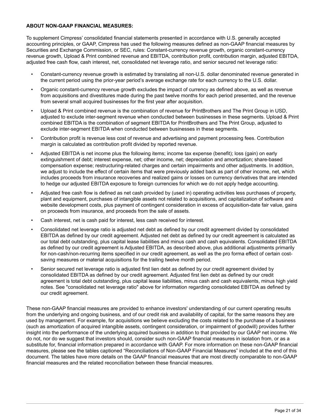ABOUT NON-GAAP FINANCIAL MEASURES: To supplement Cimpress’ consolidated financial statements presented in accordance with U.S. generally accepted accounting principles, or GAAP, Cimpress has used the following measures defined as non-GAAP financial measures by Securities and Exchange Commission, or SEC, rules: Constant-currency revenue growth, organic constant-currency revenue growth, Upload & Print combined revenue and EBITDA, contribution profit, contribution margin, adjusted EBITDA, adjusted free cash flow, cash interest, net, consolidated net leverage ratio, and senior secured net leverage ratio: • Constant-currency revenue growth is estimated by translating all non-U.S. dollar denominated revenue generated in the current period using the prior-year period’s average exchange rate for each currency to the U.S. dollar. • Organic constant-currency revenue growth excludes the impact of currency as defined above, as well as revenue from acquisitions and divestitures made during the past twelve months for each period presented, and the revenue from several small acquired businesses for the first year after acquisition. • Upload & Print combined revenue is the combination of revenue for PrintBrothers and The Print Group in USD, adjusted to exclude inter-segment revenue when conducted between businesses in these segments. Upload & Print combined EBITDA is the combination of segment EBITDA for PrintBrothers and The Print Group, adjusted to exclude inter-segment EBITDA when conducted between businesses in these segments. • Contribution profit is revenue less cost of revenue and advertising and payment processing fees. Contribution margin is calculated as contribution profit divided by reported revenue. • Adjusted EBITDA is net income plus the following items; income tax expense (benefit); loss (gain) on early extinguishment of debt; interest expense, net; other income, net; depreciation and amortization; share-based compensation expense; restructuring-related charges and certain impairments and other adjustments. In addition, we adjust to include the effect of certain items that were previously added back as part of other income, net, which includes proceeds from insurance recoveries and realized gains or losses on currency derivatives that are intended to hedge our adjusted EBITDA exposure to foreign currencies for which we do not apply hedge accounting. • Adjusted free cash flow is defined as net cash provided by (used in) operating activities less purchases of property, plant and equipment, purchases of intangible assets not related to acquisitions, and capitalization of software and website development costs, plus payment of contingent consideration in excess of acquisition-date fair value, gains on proceeds from insurance, and proceeds from the sale of assets. • Cash interest, net is cash paid for interest, less cash received for interest. • Consolidated net leverage ratio is adjusted net debt as defined by our credit agreement divided by consolidated EBITDA as defined by our credit agreement. Adjusted net debt as defined by our credit agreement is calculated as our total debt outstanding, plus capital lease liabilities and minus cash and cash equivalents. Consolidated EBITDA as defined by our credit agreement is Adjusted EBITDA, as described above, plus additional adjustments primarily for non-cash/non-recurring items specified in our credit agreement, as well as the pro forma effect of certain cost- saving measures or material acquisitions for the trailing twelve month period. • Senior secured net leverage ratio is adjusted first lien debt as defined by our credit agreement divided by consolidated EBITDA as defined by our credit agreement. Adjusted first lien debt as defined by our credit agreement is total debt outstanding, plus capital lease liabilities, minus cash and cash equivalents, minus high yield notes. See "consolidated net leverage ratio" above for information regarding consolidated EBITDA as defined by our credit agreement. These non-GAAP financial measures are provided to enhance investors' understanding of our current operating results from the underlying and ongoing business, and of our credit risk and availability of capital, for the same reasons they are used by management. For example, for acquisitions we believe excluding the costs related to the purchase of a business (such as amortization of acquired intangible assets, contingent consideration, or impairment of goodwill) provides further insight into the performance of the underlying acquired business in addition to that provided by our GAAP net income. We do not, nor do we suggest that investors should, consider such non-GAAP financial measures in isolation from, or as a substitute for, financial information prepared in accordance with GAAP. For more information on these non-GAAP financial measures, please see the tables captioned “Reconciliations of Non-GAAP Financial Measures” included at the end of this document. The tables have more details on the GAAP financial measures that are most directly comparable to non-GAAP financial measures and the related reconciliation between these financial measures. Page 21 of 34