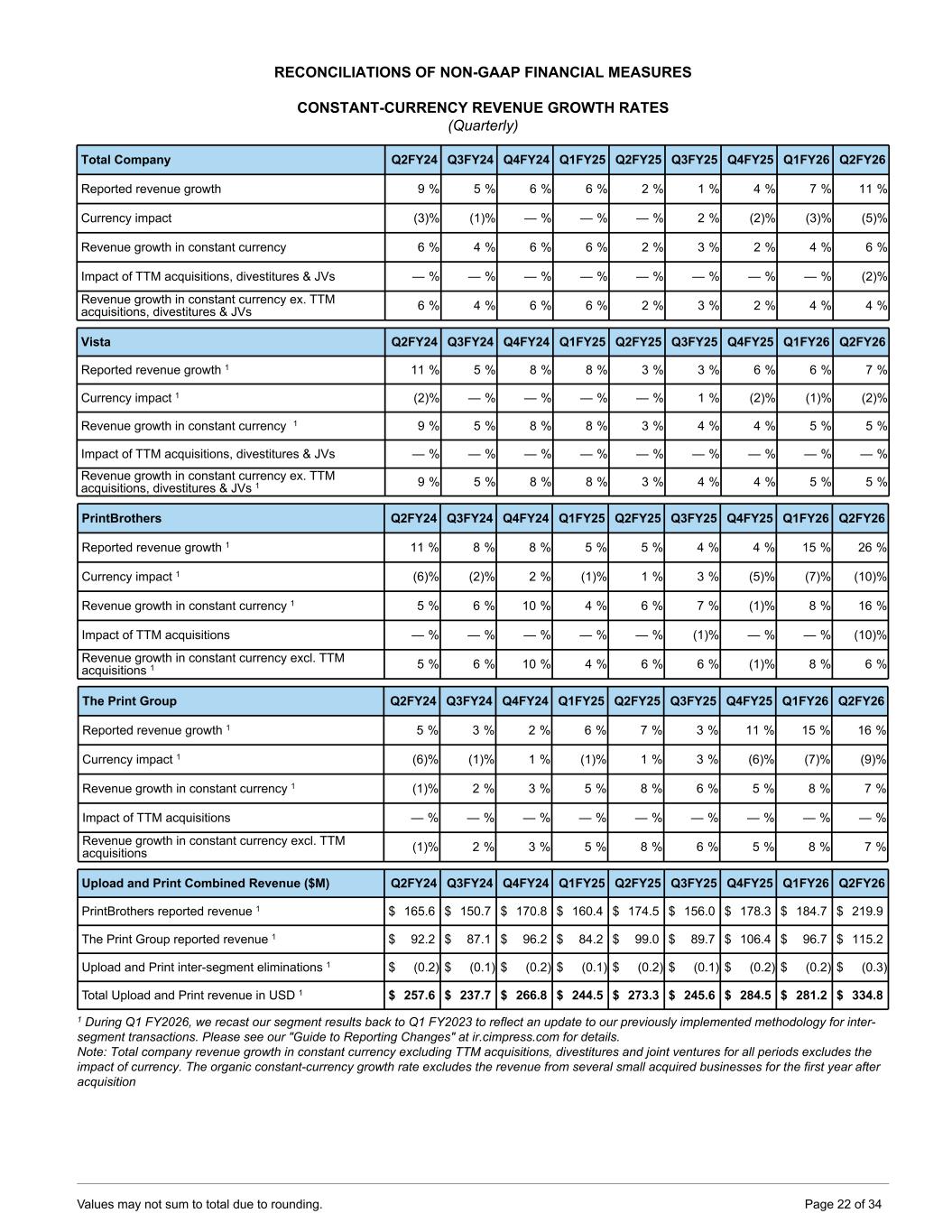 RECONCILIATIONS OF NON-GAAP FINANCIAL MEASURES CONSTANT-CURRENCY REVENUE GROWTH RATES (Quarterly) Total Company Q2FY24 Q3FY24 Q4FY24 Q1FY25 Q2FY25 Q3FY25 Q4FY25 Q1FY26 Q2FY26 Reported revenue growth 9 % 5 % 6 % 6 % 2 % 1 % 4 % 7 % 11 % Currency impact (3) % (1) % — % — % — % 2 % (2) % (3) % (5) % Revenue growth in constant currency 6 % 4 % 6 % 6 % 2 % 3 % 2 % 4 % 6 % Impact of TTM acquisitions, divestitures & JVs — % — % — % — % — % — % — % — % (2) % Revenue growth in constant currency ex. TTM acquisitions, divestitures & JVs 6 % 4 % 6 % 6 % 2 % 3 % 2 % 4 % 4 % Vista Q2FY24 Q3FY24 Q4FY24 Q1FY25 Q2FY25 Q3FY25 Q4FY25 Q1FY26 Q2FY26 Reported revenue growth 1 11 % 5 % 8 % 8 % 3 % 3 % 6 % 6 % 7 % Currency impact 1 (2) % — % — % — % — % 1 % (2) % (1) % (2) % Revenue growth in constant currency 1 9 % 5 % 8 % 8 % 3 % 4 % 4 % 5 % 5 % Impact of TTM acquisitions, divestitures & JVs — % — % — % — % — % — % — % — % — % Revenue growth in constant currency ex. TTM acquisitions, divestitures & JVs 1 9 % 5 % 8 % 8 % 3 % 4 % 4 % 5 % 5 % PrintBrothers Q2FY24 Q3FY24 Q4FY24 Q1FY25 Q2FY25 Q3FY25 Q4FY25 Q1FY26 Q2FY26 Reported revenue growth 1 11 % 8 % 8 % 5 % 5 % 4 % 4 % 15 % 26 % Currency impact 1 (6) % (2) % 2 % (1) % 1 % 3 % (5) % (7) % (10) % Revenue growth in constant currency 1 5 % 6 % 10 % 4 % 6 % 7 % (1) % 8 % 16 % Impact of TTM acquisitions — % — % — % — % — % (1) % — % — % (10) % Revenue growth in constant currency excl. TTM acquisitions 1 5 % 6 % 10 % 4 % 6 % 6 % (1) % 8 % 6 % The Print Group Q2FY24 Q3FY24 Q4FY24 Q1FY25 Q2FY25 Q3FY25 Q4FY25 Q1FY26 Q2FY26 Reported revenue growth 1 5 % 3 % 2 % 6 % 7 % 3 % 11 % 15 % 16 % Currency impact 1 (6) % (1) % 1 % (1) % 1 % 3 % (6) % (7) % (9) % Revenue growth in constant currency 1 (1) % 2 % 3 % 5 % 8 % 6 % 5 % 8 % 7 % Impact of TTM acquisitions — % — % — % — % — % — % — % — % — % Revenue growth in constant currency excl. TTM acquisitions (1) % 2 % 3 % 5 % 8 % 6 % 5 % 8 % 7 % Upload and Print Combined Revenue ($M) Q2FY24 Q3FY24 Q4FY24 Q1FY25 Q2FY25 Q3FY25 Q4FY25 Q1FY26 Q2FY26 PrintBrothers reported revenue 1 $ 165.6 $ 150.7 $ 170.8 $ 160.4 $ 174.5 $ 156.0 $ 178.3 $ 184.7 $ 219.9 The Print Group reported revenue 1 $ 92.2 $ 87.1 $ 96.2 $ 84.2 $ 99.0 $ 89.7 $ 106.4 $ 96.7 $ 115.2 Upload and Print inter-segment eliminations 1 $ (0.2) $ (0.1) $ (0.2) $ (0.1) $ (0.2) $ (0.1) $ (0.2) $ (0.2) $ (0.3) Total Upload and Print revenue in USD 1 $ 257.6 $ 237.7 $ 266.8 $ 244.5 $ 273.3 $ 245.6 $ 284.5 $ 281.2 $ 334.8 1 During Q1 FY2026, we recast our segment results back to Q1 FY2023 to reflect an update to our previously implemented methodology for inter- segment transactions. Please see our "Guide to Reporting Changes" at ir.cimpress.com for details. Note: Total company revenue growth in constant currency excluding TTM acquisitions, divestitures and joint ventures for all periods excludes the impact of currency. The organic constant-currency growth rate excludes the revenue from several small acquired businesses for the first year after acquisition Values may not sum to total due to rounding. Page 22 of 34