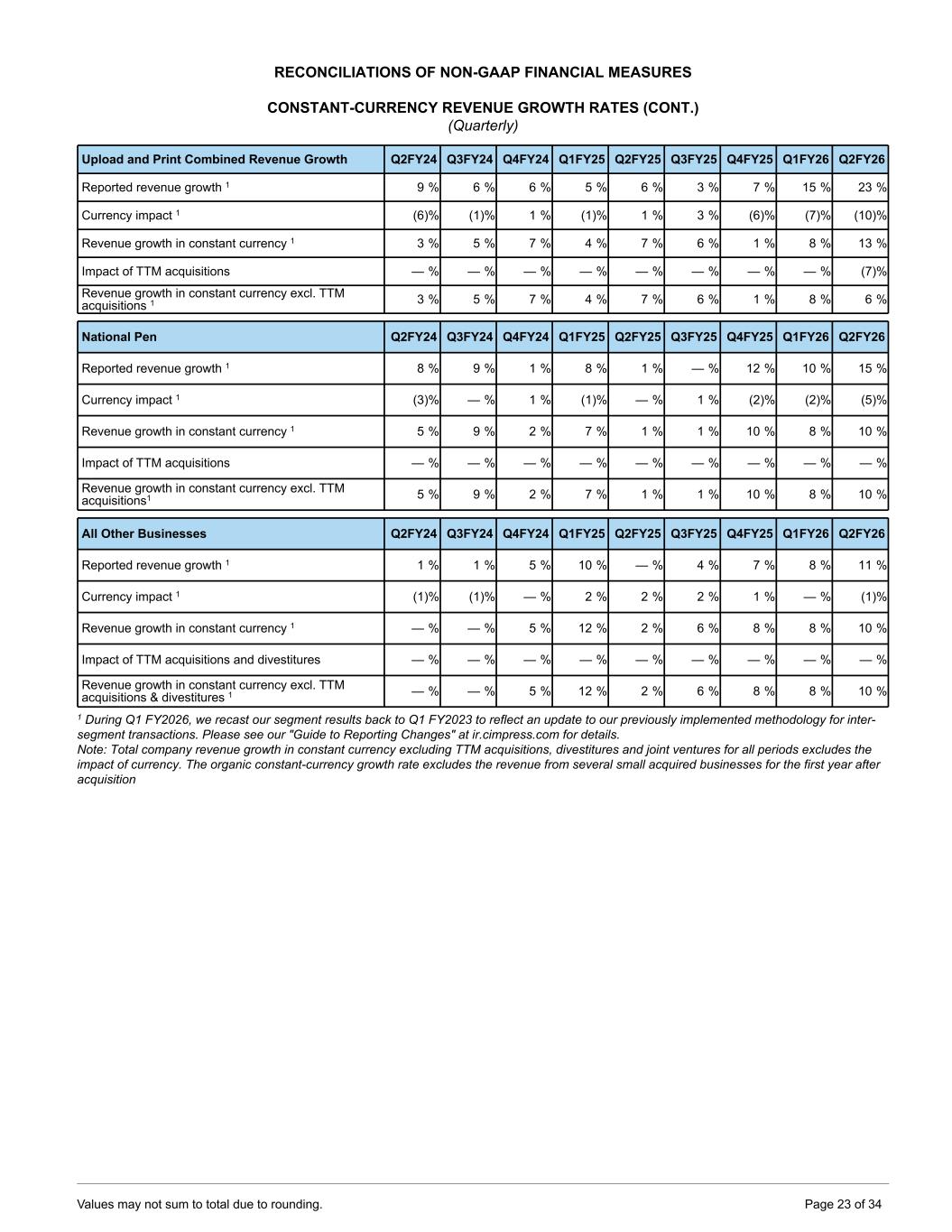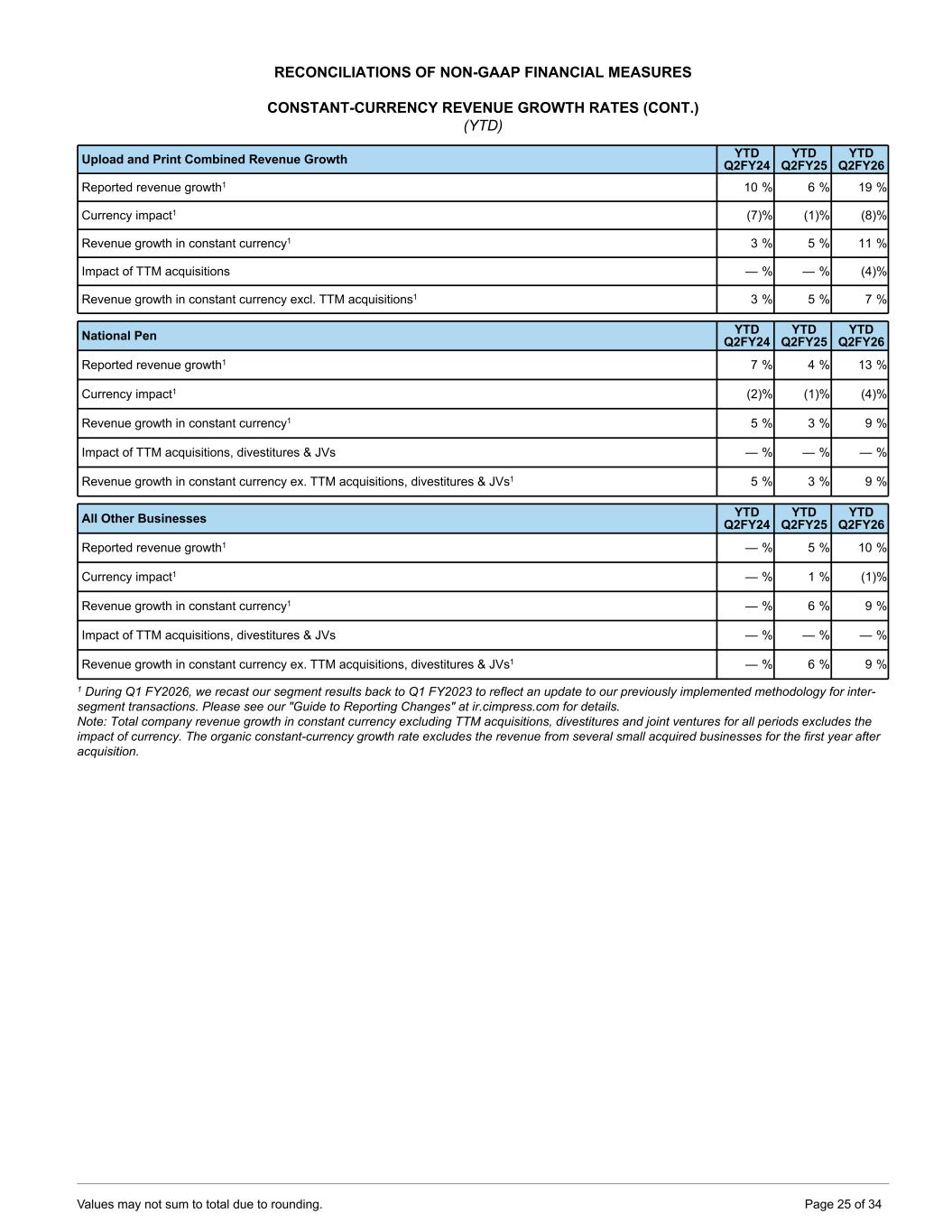 RECONCILIATIONS OF NON-GAAP FINANCIAL MEASURES CONSTANT-CURRENCY REVENUE GROWTH RATES (CONT.) (YTD) Upload and Print Combined Revenue Growth YTD Q2FY24 YTD Q2FY25 YTD Q2FY26 Reported revenue growth1 10 % 6 % 19 % Currency impact1 (7) % (1) % (8) % Revenue growth in constant currency1 3 % 5 % 11 % Impact of TTM acquisitions — % — % (4) % Revenue growth in constant currency excl. TTM acquisitions1 3 % 5 % 7 % National Pen YTD Q2FY24 YTD Q2FY25 YTD Q2FY26 Reported revenue growth1 7 % 4 % 13 % Currency impact1 (2) % (1) % (4) % Revenue growth in constant currency1 5 % 3 % 9 % Impact of TTM acquisitions, divestitures & JVs — % — % — % Revenue growth in constant currency ex. TTM acquisitions, divestitures & JVs1 5 % 3 % 9 % All Other Businesses YTD Q2FY24 YTD Q2FY25 YTD Q2FY26 Reported revenue growth1 — % 5 % 10 % Currency impact1 — % 1 % (1) % Revenue growth in constant currency1 — % 6 % 9 % Impact of TTM acquisitions, divestitures & JVs — % — % — % Revenue growth in constant currency ex. TTM acquisitions, divestitures & JVs1 — % 6 % 9 % 1 During Q1 FY2026, we recast our segment results back to Q1 FY2023 to reflect an update to our previously implemented methodology for inter- segment transactions. Please see our "Guide to Reporting Changes" at ir.cimpress.com for details. Note: Total company revenue growth in constant currency excluding TTM acquisitions, divestitures and joint ventures for all periods excludes the impact of currency. The organic constant-currency growth rate excludes the revenue from several small acquired businesses for the first year after acquisition. Values may not sum to total due to rounding. Page 25 of 34