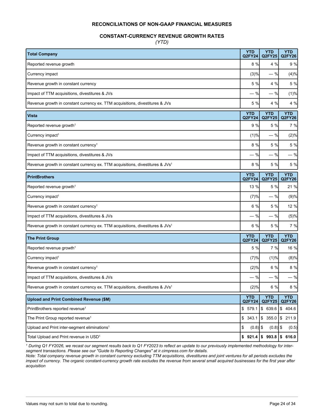 RECONCILIATIONS OF NON-GAAP FINANCIAL MEASURES CONSTANT-CURRENCY REVENUE GROWTH RATES (YTD) Total Company YTD Q2FY24 YTD Q2FY25 YTD Q2FY26 Reported revenue growth 8 % 4 % 9 % Currency impact (3) % — % (4) % Revenue growth in constant currency 5 % 4 % 5 % Impact of TTM acquisitions, divestitures & JVs — % — % (1) % Revenue growth in constant currency ex. TTM acquisitions, divestitures & JVs 5 % 4 % 4 % Vista YTD Q2FY24 YTD Q2FY25 YTD Q2FY26 Reported revenue growth1 9 % 5 % 7 % Currency impact1 (1) % — % (2) % Revenue growth in constant currency1 8 % 5 % 5 % Impact of TTM acquisitions, divestitures & JVs — % — % — % Revenue growth in constant currency ex. TTM acquisitions, divestitures & JVs1 8 % 5 % 5 % PrintBrothers YTD Q2FY24 YTD Q2FY25 YTD Q2FY26 Reported revenue growth1 13 % 5 % 21 % Currency impact1 (7) % — % (9) % Revenue growth in constant currency1 6 % 5 % 12 % Impact of TTM acquisitions, divestitures & JVs — % — % (5) % Revenue growth in constant currency ex. TTM acquisitions, divestitures & JVs1 6 % 5 % 7 % The Print Group YTD Q2FY24 YTD Q2FY25 YTD Q2FY26 Reported revenue growth1 5 % 7 % 16 % Currency impact1 (7) % (1) % (8) % Revenue growth in constant currency1 (2) % 6 % 8 % Impact of TTM acquisitions, divestitures & JVs — % — % — % Revenue growth in constant currency ex. TTM acquisitions, divestitures & JVs1 (2) % 6 % 8 % Upload and Print Combined Revenue ($M) YTD Q2FY24 YTD Q2FY25 YTD Q2FY26 PrintBrothers reported revenue1 $ 579.1 $ 639.6 $ 404.6 The Print Group reported revenue1 $ 343.1 $ 355.0 $ 211.9 Upload and Print inter-segment eliminations1 $ (0.8) $ (0.8) $ (0.5) Total Upload and Print revenue in USD1 $ 921.4 $ 993.8 $ 616.0 1 During Q1 FY2026, we recast our segment results back to Q1 FY2023 to reflect an update to our previously implemented methodology for inter- segment transactions. Please see our "Guide to Reporting Changes" at ir.cimpress.com for details. Note: Total company revenue growth in constant currency excluding TTM acquisitions, divestitures and joint ventures for all periods excludes the impact of currency. The organic constant-currency growth rate excludes the revenue from several small acquired businesses for the first year after acquisition Values may not sum to total due to rounding. Page 24 of 34