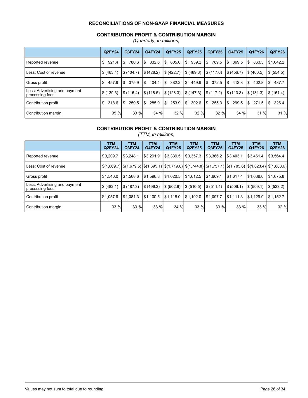 RECONCILIATIONS OF NON-GAAP FINANCIAL MEASURES CONTRIBUTION PROFIT & CONTRIBUTION MARGIN (Quarterly, in millions) Q2FY24 Q3FY24 Q4FY24 Q1FY25 Q2FY25 Q3FY25 Q4FY25 Q1FY26 Q2FY26 Reported revenue $ 921.4 $ 780.6 $ 832.6 $ 805.0 $ 939.2 $ 789.5 $ 869.5 $ 863.3 $ 1,042.2 Less: Cost of revenue $ (463.4) $ (404.7) $ (428.2) $ (422.7) $ (489.3) $ (417.0) $ (456.7) $ (460.5) $ (554.5) Gross profit $ 457.9 $ 375.9 $ 404.4 $ 382.2 $ 449.9 $ 372.5 $ 412.8 $ 402.8 $ 487.7 Less: Advertising and payment processing fees $ (139.3) $ (116.4) $ (118.5) $ (128.3) $ (147.3) $ (117.2) $ (113.3) $ (131.3) $ (161.4) Contribution profit $ 318.6 $ 259.5 $ 285.9 $ 253.9 $ 302.6 $ 255.3 $ 299.5 $ 271.5 $ 326.4 Contribution margin 35 % 33 % 34 % 32 % 32 % 32 % 34 % 31 % 31 % CONTRIBUTION PROFIT & CONTRIBUTION MARGIN (TTM, in millions) TTM Q2FY24 TTM Q3FY24 TTM Q4FY24 TTM Q1FY25 TTM Q2FY25 TTM Q3FY25 TTM Q4FY25 TTM Q1FY26 TTM Q2FY26 Reported revenue $ 3,209.7 $ 3,248.1 $ 3,291.9 $ 3,339.5 $ 3,357.3 $ 3,366.2 $ 3,403.1 $ 3,461.4 $ 3,564.4 Less: Cost of revenue $ (1,669.7) $ (1,679.5) $ (1,695.1) $ (1,719.0) $ (1,744.8) $ (1,757.1) $ (1,785.6) $ (1,823.4) $ (1,888.6) Gross profit $ 1,540.0 $ 1,568.6 $ 1,596.8 $ 1,620.5 $ 1,612.5 $ 1,609.1 $ 1,617.4 $ 1,638.0 $ 1,675.8 Less: Advertising and payment processing fees $ (482.1) $ (487.3) $ (496.3) $ (502.6) $ (510.5) $ (511.4) $ (506.1) $ (509.1) $ (523.2) Contribution profit $ 1,057.9 $ 1,081.3 $ 1,100.5 $ 1,118.0 $ 1,102.0 $ 1,097.7 $ 1,111.3 $ 1,129.0 $ 1,152.7 Contribution margin 33 % 33 % 33 % 34 % 33 % 33 % 33 % 33 % 32 % Values may not sum to total due to rounding. Page 26 of 34