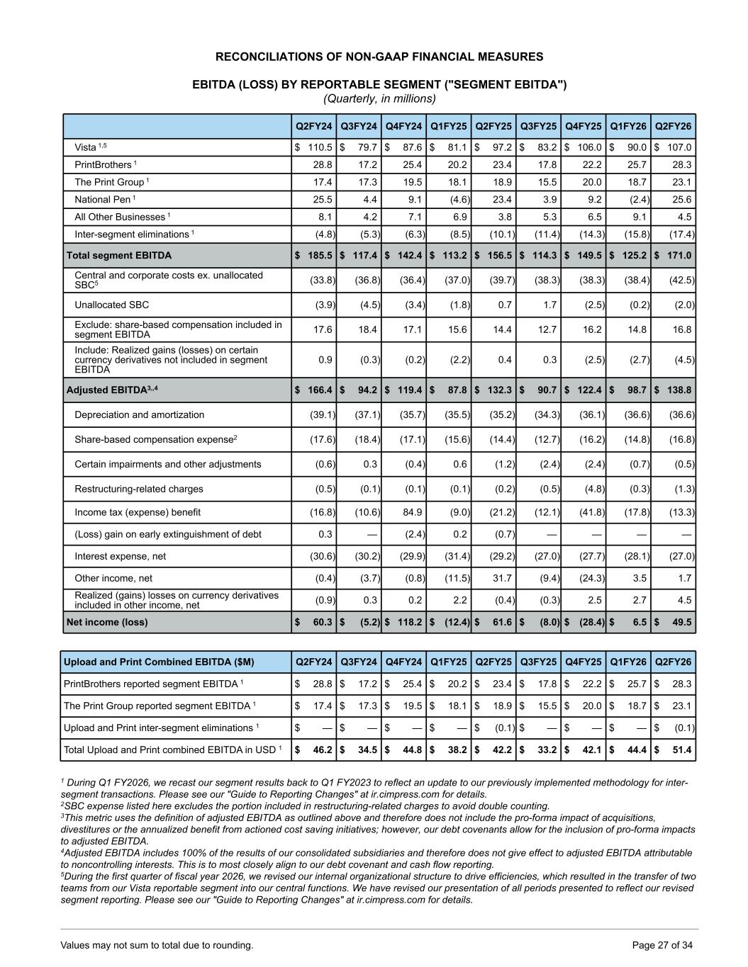 RECONCILIATIONS OF NON-GAAP FINANCIAL MEASURES EBITDA (LOSS) BY REPORTABLE SEGMENT ("SEGMENT EBITDA") (Quarterly, in millions) Q2FY24 Q3FY24 Q4FY24 Q1FY25 Q2FY25 Q3FY25 Q4FY25 Q1FY26 Q2FY26 Vista 1,5 $ 110.5 $ 79.7 $ 87.6 $ 81.1 $ 97.2 $ 83.2 $ 106.0 $ 90.0 $ 107.0 PrintBrothers 1 28.8 17.2 25.4 20.2 23.4 17.8 22.2 25.7 28.3 The Print Group 1 17.4 17.3 19.5 18.1 18.9 15.5 20.0 18.7 23.1 National Pen 1 25.5 4.4 9.1 (4.6) 23.4 3.9 9.2 (2.4) 25.6 All Other Businesses 1 8.1 4.2 7.1 6.9 3.8 5.3 6.5 9.1 4.5 Inter-segment eliminations 1 (4.8) (5.3) (6.3) (8.5) (10.1) (11.4) (14.3) (15.8) (17.4) Total segment EBITDA $ 185.5 $ 117.4 $ 142.4 $ 113.2 $ 156.5 $ 114.3 $ 149.5 $ 125.2 $ 171.0 Central and corporate costs ex. unallocated SBC5 (33.8) (36.8) (36.4) (37.0) (39.7) (38.3) (38.3) (38.4) (42.5) Unallocated SBC (3.9) (4.5) (3.4) (1.8) 0.7 1.7 (2.5) (0.2) (2.0) Exclude: share-based compensation included in segment EBITDA 17.6 18.4 17.1 15.6 14.4 12.7 16.2 14.8 16.8 Include: Realized gains (losses) on certain currency derivatives not included in segment EBITDA 0.9 (0.3) (0.2) (2.2) 0.4 0.3 (2.5) (2.7) (4.5) Adjusted EBITDA3,,4 $ 166.4 $ 94.2 $ 119.4 $ 87.8 $ 132.3 $ 90.7 $ 122.4 $ 98.7 $ 138.8 Depreciation and amortization (39.1) (37.1) (35.7) (35.5) (35.2) (34.3) (36.1) (36.6) (36.6) Share-based compensation expense2 (17.6) (18.4) (17.1) (15.6) (14.4) (12.7) (16.2) (14.8) (16.8) Certain impairments and other adjustments (0.6) 0.3 (0.4) 0.6 (1.2) (2.4) (2.4) (0.7) (0.5) Restructuring-related charges (0.5) (0.1) (0.1) (0.1) (0.2) (0.5) (4.8) (0.3) (1.3) Income tax (expense) benefit (16.8) (10.6) 84.9 (9.0) (21.2) (12.1) (41.8) (17.8) (13.3) (Loss) gain on early extinguishment of debt 0.3 — (2.4) 0.2 (0.7) — — — — Interest expense, net (30.6) (30.2) (29.9) (31.4) (29.2) (27.0) (27.7) (28.1) (27.0) Other income, net (0.4) (3.7) (0.8) (11.5) 31.7 (9.4) (24.3) 3.5 1.7 Realized (gains) losses on currency derivatives included in other income, net (0.9) 0.3 0.2 2.2 (0.4) (0.3) 2.5 2.7 4.5 Net income (loss) $ 60.3 $ (5.2) $ 118.2 $ (12.4) $ 61.6 $ (8.0) $ (28.4) $ 6.5 $ 49.5 Upload and Print Combined EBITDA ($M) Q2FY24 Q3FY24 Q4FY24 Q1FY25 Q2FY25 Q3FY25 Q4FY25 Q1FY26 Q2FY26 PrintBrothers reported segment EBITDA 1 $ 28.8 $ 17.2 $ 25.4 $ 20.2 $ 23.4 $ 17.8 $ 22.2 $ 25.7 $ 28.3 The Print Group reported segment EBITDA 1 $ 17.4 $ 17.3 $ 19.5 $ 18.1 $ 18.9 $ 15.5 $ 20.0 $ 18.7 $ 23.1 Upload and Print inter-segment eliminations 1 $ — $ — $ — $ — $ (0.1) $ — $ — $ — $ (0.1) Total Upload and Print combined EBITDA in USD 1 $ 46.2 $ 34.5 $ 44.8 $ 38.2 $ 42.2 $ 33.2 $ 42.1 $ 44.4 $ 51.4 1 During Q1 FY2026, we recast our segment results back to Q1 FY2023 to reflect an update to our previously implemented methodology for inter- segment transactions. Please see our "Guide to Reporting Changes" at ir.cimpress.com for details. 2SBC expense listed here excludes the portion included in restructuring-related charges to avoid double counting. 3This metric uses the definition of adjusted EBITDA as outlined above and therefore does not include the pro-forma impact of acquisitions, divestitures or the annualized benefit from actioned cost saving initiatives; however, our debt covenants allow for the inclusion of pro-forma impacts to adjusted EBITDA. 4Adjusted EBITDA includes 100% of the results of our consolidated subsidiaries and therefore does not give effect to adjusted EBITDA attributable to noncontrolling interests. This is to most closely align to our debt covenant and cash flow reporting. 5During the first quarter of fiscal year 2026, we revised our internal organizational structure to drive efficiencies, which resulted in the transfer of two teams from our Vista reportable segment into our central functions. We have revised our presentation of all periods presented to reflect our revised segment reporting. Please see our "Guide to Reporting Changes" at ir.cimpress.com for details. Values may not sum to total due to rounding. Page 27 of 34