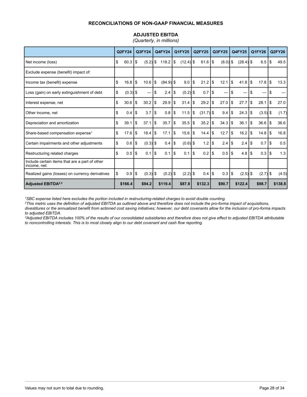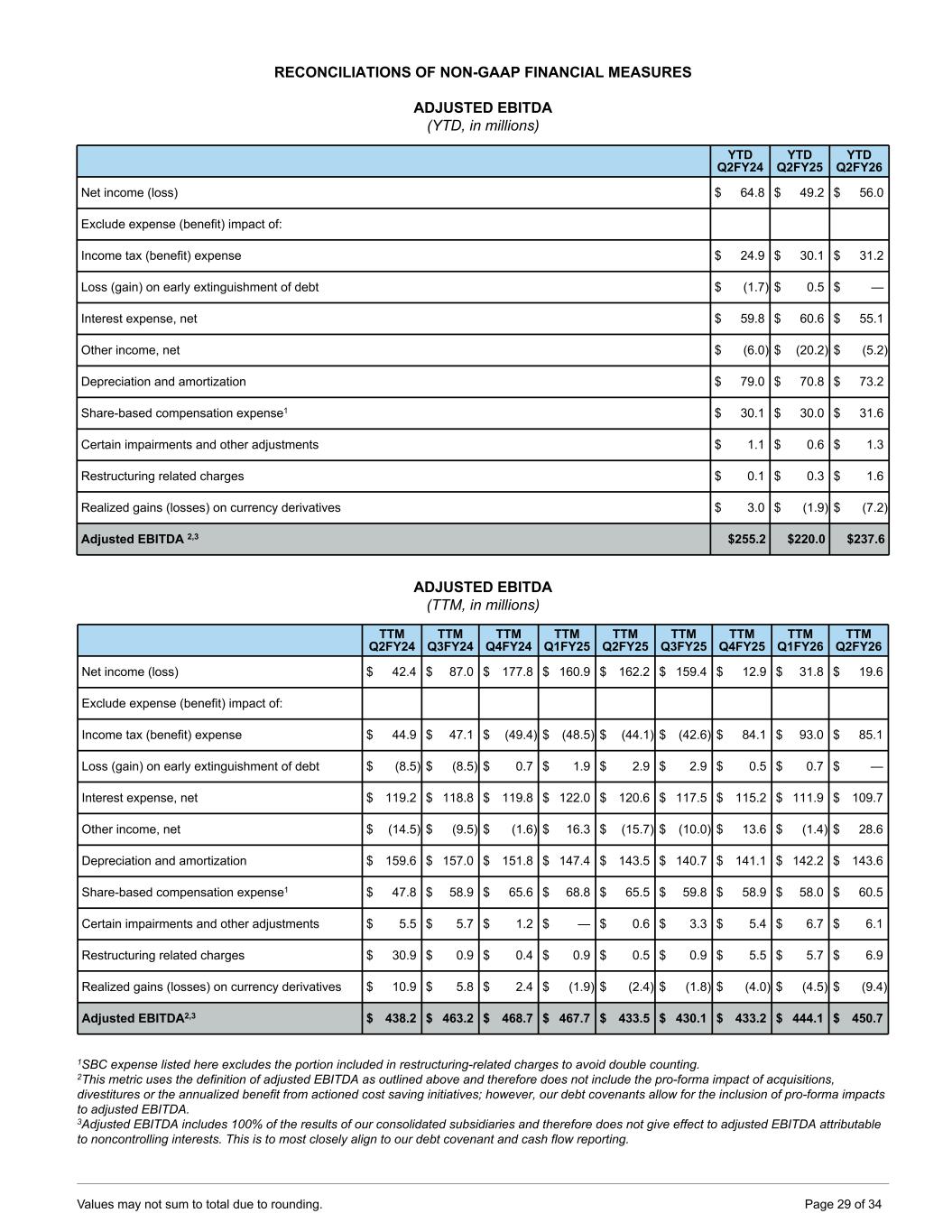 RECONCILIATIONS OF NON-GAAP FINANCIAL MEASURES ADJUSTED EBITDA (Quarterly, in millions) Q2FY24 Q3FY24 Q4FY24 Q1FY25 Q2FY25 Q3FY25 Q4FY25 Q1FY26 Q2FY26 Net income (loss) $ 60.3 $ (5.2) $ 118.2 $ (12.4) $ 61.6 $ (8.0) $ (28.4) $ 6.5 $ 49.5 Exclude expense (benefit) impact of: Income tax (benefit) expense $ 16.8 $ 10.6 $ (84.9) $ 9.0 $ 21.2 $ 12.1 $ 41.8 $ 17.8 $ 13.3 Loss (gain) on early extinguishment of debt $ (0.3) $ — $ 2.4 $ (0.2) $ 0.7 $ — $ — $ — $ — Interest expense, net $ 30.6 $ 30.2 $ 29.9 $ 31.4 $ 29.2 $ 27.0 $ 27.7 $ 28.1 $ 27.0 Other income, net $ 0.4 $ 3.7 $ 0.8 $ 11.5 $ (31.7) $ 9.4 $ 24.3 $ (3.5) $ (1.7) Depreciation and amortization $ 39.1 $ 37.1 $ 35.7 $ 35.5 $ 35.2 $ 34.3 $ 36.1 $ 36.6 $ 36.6 Share-based compensation expense1 $ 17.6 $ 18.4 $ 17.1 $ 15.6 $ 14.4 $ 12.7 $ 16.2 $ 14.8 $ 16.8 Certain impairments and other adjustments $ 0.6 $ (0.3) $ 0.4 $ (0.6) $ 1.2 $ 2.4 $ 2.4 $ 0.7 $ 0.5 Restructuring related charges $ 0.5 $ 0.1 $ 0.1 $ 0.1 $ 0.2 $ 0.5 $ 4.8 $ 0.3 $ 1.3 Include certain items that are a part of other income, net: Realized gains (losses) on currency derivatives $ 0.9 $ (0.3) $ (0.2) $ (2.2) $ 0.4 $ 0.3 $ (2.5) $ (2.7) $ (4.5) Adjusted EBITDA2,3 $166.4 $94.2 $119.4 $87.8 $132.3 $90.7 $122.4 $98.7 $138.8 1SBC expense listed here excludes the portion included in restructuring-related charges to avoid double counting. 2This metric uses the definition of adjusted EBITDA as outlined above and therefore does not include the pro-forma impact of acquisitions, divestitures or the annualized benefit from actioned cost saving initiatives; however, our debt covenants allow for the inclusion of pro-forma impacts to adjusted EBITDA. 3Adjusted EBITDA includes 100% of the results of our consolidated subsidiaries and therefore does not give effect to adjusted EBITDA attributable to noncontrolling interests. This is to most closely align to our debt covenant and cash flow reporting. Values may not sum to total due to rounding. Page 28 of 34
