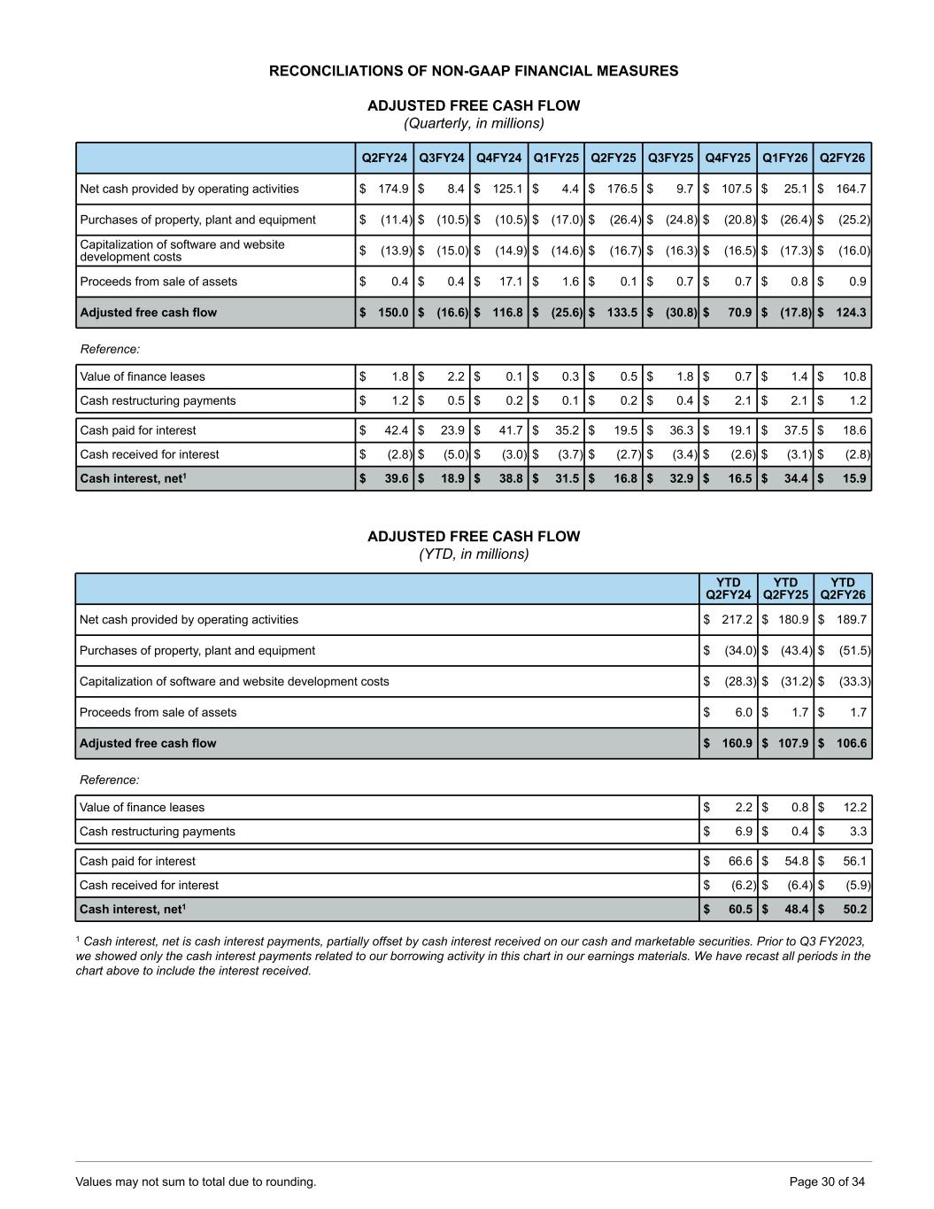 RECONCILIATIONS OF NON-GAAP FINANCIAL MEASURES ADJUSTED FREE CASH FLOW (Quarterly, in millions) Q2FY24 Q3FY24 Q4FY24 Q1FY25 Q2FY25 Q3FY25 Q4FY25 Q1FY26 Q2FY26 Net cash provided by operating activities $ 174.9 $ 8.4 $ 125.1 $ 4.4 $ 176.5 $ 9.7 $ 107.5 $ 25.1 $ 164.7 Purchases of property, plant and equipment $ (11.4) $ (10.5) $ (10.5) $ (17.0) $ (26.4) $ (24.8) $ (20.8) $ (26.4) $ (25.2) Capitalization of software and website development costs $ (13.9) $ (15.0) $ (14.9) $ (14.6) $ (16.7) $ (16.3) $ (16.5) $ (17.3) $ (16.0) Proceeds from sale of assets $ 0.4 $ 0.4 $ 17.1 $ 1.6 $ 0.1 $ 0.7 $ 0.7 $ 0.8 $ 0.9 Adjusted free cash flow $ 150.0 $ (16.6) $ 116.8 $ (25.6) $ 133.5 $ (30.8) $ 70.9 $ (17.8) $ 124.3 Reference: Value of finance leases $ 1.8 $ 2.2 $ 0.1 $ 0.3 $ 0.5 $ 1.8 $ 0.7 $ 1.4 $ 10.8 Cash restructuring payments $ 1.2 $ 0.5 $ 0.2 $ 0.1 $ 0.2 $ 0.4 $ 2.1 $ 2.1 $ 1.2 Cash paid for interest $ 42.4 $ 23.9 $ 41.7 $ 35.2 $ 19.5 $ 36.3 $ 19.1 $ 37.5 $ 18.6 Cash received for interest $ (2.8) $ (5.0) $ (3.0) $ (3.7) $ (2.7) $ (3.4) $ (2.6) $ (3.1) $ (2.8) Cash interest, net1 $ 39.6 $ 18.9 $ 38.8 $ 31.5 $ 16.8 $ 32.9 $ 16.5 $ 34.4 $ 15.9 ADJUSTED FREE CASH FLOW (YTD, in millions) YTD Q2FY24 YTD Q2FY25 YTD Q2FY26 Net cash provided by operating activities $ 217.2 $ 180.9 $ 189.7 Purchases of property, plant and equipment $ (34.0) $ (43.4) $ (51.5) Capitalization of software and website development costs $ (28.3) $ (31.2) $ (33.3) Proceeds from sale of assets $ 6.0 $ 1.7 $ 1.7 Adjusted free cash flow $ 160.9 $ 107.9 $ 106.6 Reference: Value of finance leases $ 2.2 $ 0.8 $ 12.2 Cash restructuring payments $ 6.9 $ 0.4 $ 3.3 Cash paid for interest $ 66.6 $ 54.8 $ 56.1 Cash received for interest $ (6.2) $ (6.4) $ (5.9) Cash interest, net1 $ 60.5 $ 48.4 $ 50.2 1 Cash interest, net is cash interest payments, partially offset by cash interest received on our cash and marketable securities. Prior to Q3 FY2023, we showed only the cash interest payments related to our borrowing activity in this chart in our earnings materials. We have recast all periods in the chart above to include the interest received. Values may not sum to total due to rounding. Page 30 of 34
