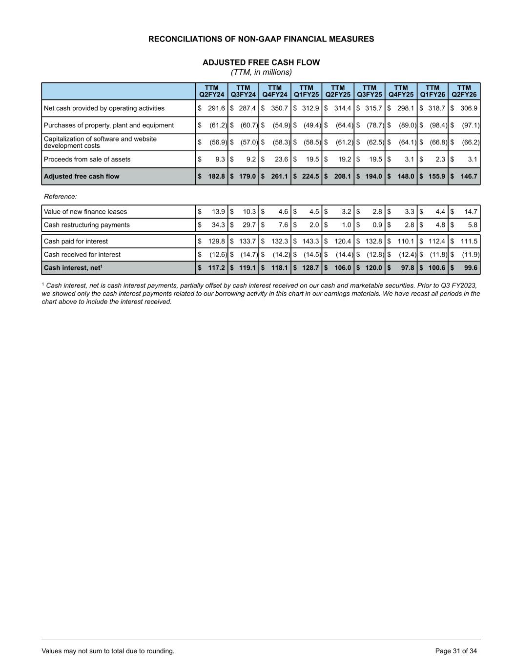 RECONCILIATIONS OF NON-GAAP FINANCIAL MEASURES ADJUSTED FREE CASH FLOW (TTM, in millions) TTM Q2FY24 TTM Q3FY24 TTM Q4FY24 TTM Q1FY25 TTM Q2FY25 TTM Q3FY25 TTM Q4FY25 TTM Q1FY26 TTM Q2FY26 Net cash provided by operating activities $ 291.6 $ 287.4 $ 350.7 $ 312.9 $ 314.4 $ 315.7 $ 298.1 $ 318.7 $ 306.9 Purchases of property, plant and equipment $ (61.2) $ (60.7) $ (54.9) $ (49.4) $ (64.4) $ (78.7) $ (89.0) $ (98.4) $ (97.1) Capitalization of software and website development costs $ (56.9) $ (57.0) $ (58.3) $ (58.5) $ (61.2) $ (62.5) $ (64.1) $ (66.8) $ (66.2) Proceeds from sale of assets $ 9.3 $ 9.2 $ 23.6 $ 19.5 $ 19.2 $ 19.5 $ 3.1 $ 2.3 $ 3.1 Adjusted free cash flow $ 182.8 $ 179.0 $ 261.1 $ 224.5 $ 208.1 $ 194.0 $ 148.0 $ 155.9 $ 146.7 Reference: Value of new finance leases $ 13.9 $ 10.3 $ 4.6 $ 4.5 $ 3.2 $ 2.8 $ 3.3 $ 4.4 $ 14.7 Cash restructuring payments $ 34.3 $ 29.7 $ 7.6 $ 2.0 $ 1.0 $ 0.9 $ 2.8 $ 4.8 $ 5.8 Cash paid for interest $ 129.8 $ 133.7 $ 132.3 $ 143.3 $ 120.4 $ 132.8 $ 110.1 $ 112.4 $ 111.5 Cash received for interest $ (12.6) $ (14.7) $ (14.2) $ (14.5) $ (14.4) $ (12.8) $ (12.4) $ (11.8) $ (11.9) Cash interest, net1 $ 117.2 $ 119.1 $ 118.1 $ 128.7 $ 106.0 $ 120.0 $ 97.8 $ 100.6 $ 99.6 1 Cash interest, net is cash interest payments, partially offset by cash interest received on our cash and marketable securities. Prior to Q3 FY2023, we showed only the cash interest payments related to our borrowing activity in this chart in our earnings materials. We have recast all periods in the chart above to include the interest received. Values may not sum to total due to rounding. Page 31 of 34