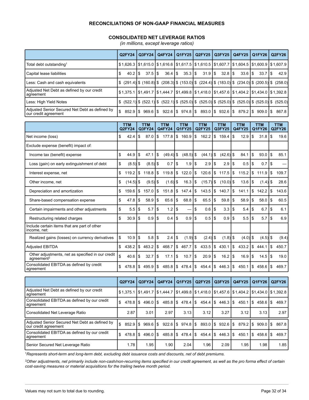 RECONCILIATIONS OF NON-GAAP FINANCIAL MEASURES CONSOLIDATED NET LEVERAGE RATIOS (in millions, except leverage ratios) Q2FY24 Q3FY24 Q4FY24 Q1FY25 Q2FY25 Q3FY25 Q4FY25 Q1FY26 Q2FY26 Total debt outstanding1 $ 1,626.3 $ 1,615.0 $ 1,616.6 $ 1,617.5 $ 1,610.5 $ 1,607.7 $ 1,604.5 $ 1,600.9 $ 1,607.9 Capital lease liabilities $ 40.2 $ 37.5 $ 36.4 $ 35.3 $ 31.9 $ 32.8 $ 33.6 $ 33.7 $ 42.9 Less: Cash and cash equivalents $ (291.4) $ (160.8) $ (208.3) $ (153.0) $ (224.4) $ (183.0) $ (234.0) $ (200.5) $ (258.0) Adjusted Net Debt as defined by our credit agreement $ 1,375.1 $ 1,491.7 $ 1,444.7 $ 1,499.8 $ 1,418.0 $ 1,457.6 $ 1,404.2 $ 1,434.0 $ 1,392.8 Less: High Yield Notes $ (522.1) $ (522.1) $ (522.1) $ (525.0) $ (525.0) $ (525.0) $ (525.0) $ (525.0) $ (525.0) Adjusted Senior Secured Net Debt as defined by our credit agreement $ 852.9 $ 969.6 $ 922.6 $ 974.8 $ 893.0 $ 932.6 $ 879.2 $ 909.0 $ 867.8 TTM Q2FY24 TTM Q3FY24 TTM Q4FY24 TTM Q1FY25 TTM Q2FY25 TTM Q3FY25 TTM Q4FY25 TTM Q1FY26 TTM Q2FY26 Net income (loss) $ 42.4 $ 87.0 $ 177.8 $ 160.9 $ 162.2 $ 159.4 $ 12.9 $ 31.8 $ 19.6 Exclude expense (benefit) impact of: Income tax (benefit) expense $ 44.9 $ 47.1 $ (49.4) $ (48.5) $ (44.1) $ (42.6) $ 84.1 $ 93.0 $ 85.1 Loss (gain) on early extinguishment of debt $ (8.5) $ (8.5) $ 0.7 $ 1.9 $ 2.9 $ 2.9 $ 0.5 $ 0.7 $ — Interest expense, net $ 119.2 $ 118.8 $ 119.8 $ 122.0 $ 120.6 $ 117.5 $ 115.2 $ 111.9 $ 109.7 Other income, net $ (14.5) $ (9.5) $ (1.6) $ 16.3 $ (15.7) $ (10.0) $ 13.6 $ (1.4) $ 28.6 Depreciation and amortization $ 159.6 $ 157.0 $ 151.8 $ 147.4 $ 143.5 $ 140.7 $ 141.1 $ 142.2 $ 143.6 Share-based compensation expense $ 47.8 $ 58.9 $ 65.6 $ 68.8 $ 65.5 $ 59.8 $ 58.9 $ 58.0 $ 60.5 Certain impairments and other adjustments $ 5.5 $ 5.7 $ 1.2 $ — $ 0.6 $ 3.3 $ 5.4 $ 6.7 $ 6.1 Restructuring related charges $ 30.9 $ 0.9 $ 0.4 $ 0.9 $ 0.5 $ 0.9 $ 5.5 $ 5.7 $ 6.9 Include certain items that are part of other income, net: Realized gains (losses) on currency derivatives $ 10.9 $ 5.8 $ 2.4 $ (1.9) $ (2.4) $ (1.8) $ (4.0) $ (4.5) $ (9.4) Adjusted EBITDA $ 438.2 $ 463.2 $ 468.7 $ 467.7 $ 433.5 $ 430.1 $ 433.2 $ 444.1 $ 450.7 Other adjustments, net as specified in our credit agreement2 $ 40.6 $ 32.7 $ 17.1 $ 10.7 $ 20.9 $ 16.2 $ 16.9 $ 14.5 $ 19.0 Consolidated EBITDA as defined by credit agreement $ 478.8 $ 495.9 $ 485.8 $ 478.4 $ 454.4 $ 446.3 $ 450.1 $ 458.6 $ 469.7 Q2FY24 Q3FY24 Q4FY24 Q1FY25 Q2FY25 Q3FY25 Q4FY25 Q1FY26 Q2FY26 Adjusted Net Debt as defined by our credit agreement $ 1,375.1 $ 1,491.7 $ 1,444.7 $ 1,499.8 $ 1,418.0 $ 1,457.6 $ 1,404.2 $ 1,434.0 $ 1,392.8 Consolidated EBITDA as defined by our credit agreement $ 478.8 $ 496.0 $ 485.8 $ 478.4 $ 454.4 $ 446.3 $ 450.1 $ 458.6 $ 469.7 Consolidated Net Leverage Ratio 2.87 3.01 2.97 3.13 3.12 3.27 3.12 3.13 2.97 Adjusted Senior Secured Net Debt as defined by our credit agreement $ 852.9 $ 969.6 $ 922.6 $ 974.8 $ 893.0 $ 932.6 $ 879.2 $ 909.0 $ 867.8 Consolidated EBITDA as defined by our credit agreement $ 478.8 $ 496.0 $ 485.8 $ 478.4 $ 454.4 $ 446.3 $ 450.1 $ 458.6 $ 469.7 Senior Secured Net Leverage Ratio 1.78 1.95 1.90 2.04 1.96 2.09 1.95 1.98 1.85 1Represents short-term and long-term debt, excluding debt issuance costs and discounts, net of debt premiums. 2Other adjustments, net primarily include non-cash/non-recurring items specified in our credit agreement, as well as the pro forma effect of certain cost-saving measures or material acquisitions for the trailing twelve month period. Values may not sum to total due to rounding. Page 32 of 34