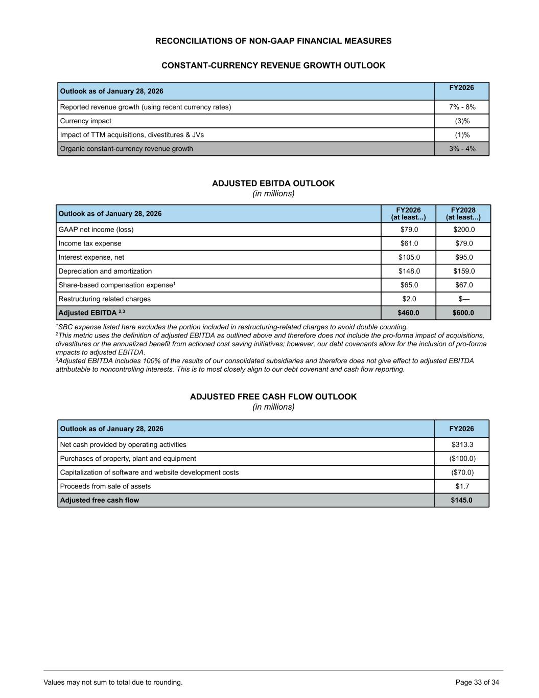 RECONCILIATIONS OF NON-GAAP FINANCIAL MEASURES CONSTANT-CURRENCY REVENUE GROWTH OUTLOOK Outlook as of January 28, 2026 FY2026 Reported revenue growth (using recent currency rates) 7% - 8% Currency impact (3)% Impact of TTM acquisitions, divestitures & JVs (1)% Organic constant-currency revenue growth 3% - 4% ADJUSTED EBITDA OUTLOOK (in millions) Outlook as of January 28, 2026 FY2026 (at least...) FY2028 (at least...) GAAP net income (loss) $79.0 $200.0 Income tax expense $61.0 $79.0 Interest expense, net $105.0 $95.0 Depreciation and amortization $148.0 $159.0 Share-based compensation expense1 $65.0 $67.0 Restructuring related charges $2.0 $— Adjusted EBITDA 2,3 $460.0 $600.0 1SBC expense listed here excludes the portion included in restructuring-related charges to avoid double counting. 2This metric uses the definition of adjusted EBITDA as outlined above and therefore does not include the pro-forma impact of acquisitions, divestitures or the annualized benefit from actioned cost saving initiatives; however, our debt covenants allow for the inclusion of pro-forma impacts to adjusted EBITDA. 3Adjusted EBITDA includes 100% of the results of our consolidated subsidiaries and therefore does not give effect to adjusted EBITDA attributable to noncontrolling interests. This is to most closely align to our debt covenant and cash flow reporting. ADJUSTED FREE CASH FLOW OUTLOOK (in millions) Outlook as of January 28, 2026 FY2026 Net cash provided by operating activities $313.3 Purchases of property, plant and equipment ($100.0) Capitalization of software and website development costs ($70.0) Proceeds from sale of assets $1.7 Adjusted free cash flow $145.0 Values may not sum to total due to rounding. Page 33 of 34