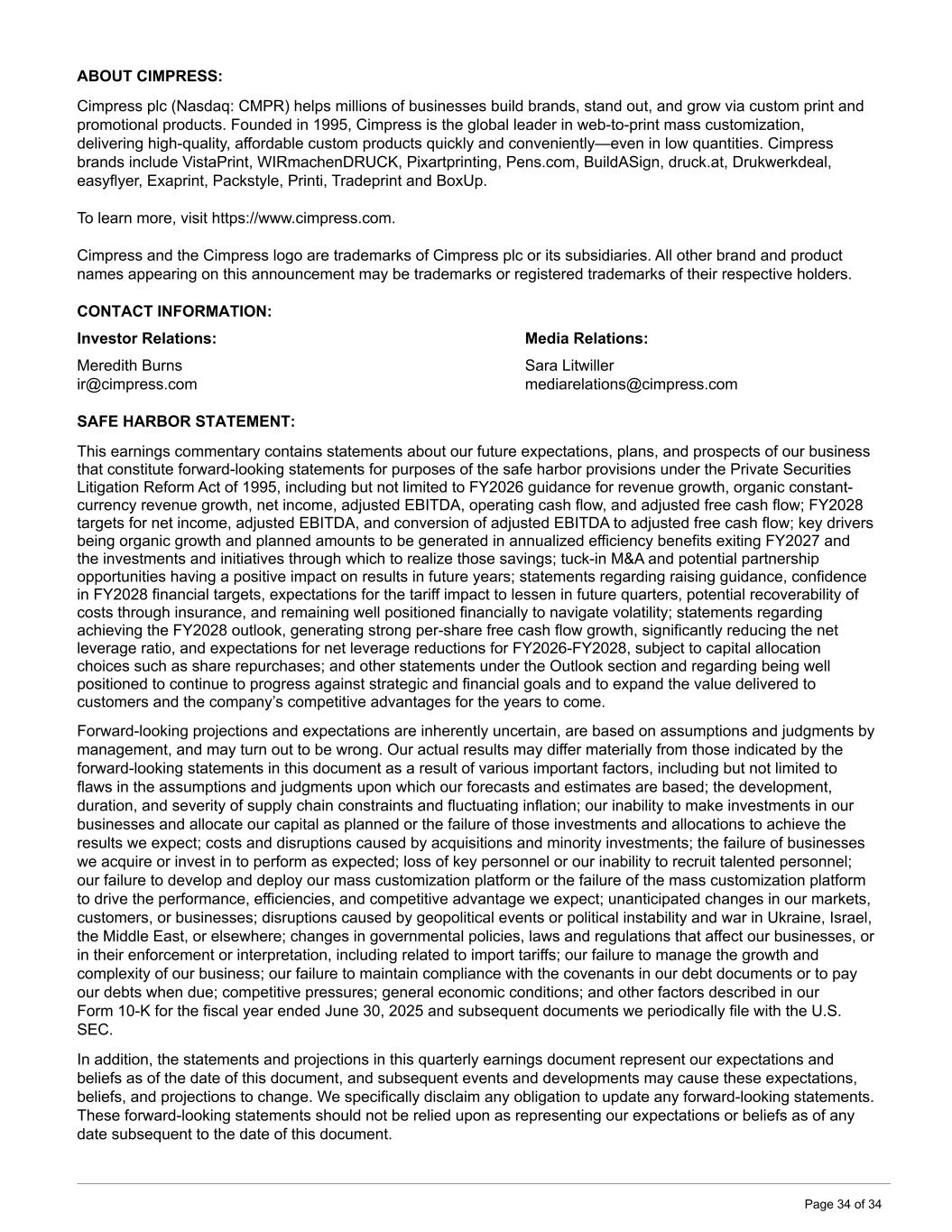 ABOUT CIMPRESS: Cimpress plc (Nasdaq: CMPR) helps millions of businesses build brands, stand out, and grow via custom print and promotional products. Founded in 1995, Cimpress is the global leader in web-to-print mass customization, delivering high-quality, affordable custom products quickly and conveniently—even in low quantities. Cimpress brands include VistaPrint, WIRmachenDRUCK, Pixartprinting, Pens.com, BuildASign, druck.at, Drukwerkdeal, easyflyer, Exaprint, Packstyle, Printi, Tradeprint and BoxUp. To learn more, visit https://www.cimpress.com. Cimpress and the Cimpress logo are trademarks of Cimpress plc or its subsidiaries. All other brand and product names appearing on this announcement may be trademarks or registered trademarks of their respective holders. CONTACT INFORMATION: Investor Relations: Media Relations: Meredith Burns Sara Litwiller ir@cimpress.com mediarelations@cimpress.com SAFE HARBOR STATEMENT: This earnings commentary contains statements about our future expectations, plans, and prospects of our business that constitute forward-looking statements for purposes of the safe harbor provisions under the Private Securities Litigation Reform Act of 1995, including but not limited to FY2026 guidance for revenue growth, organic constant- currency revenue growth, net income, adjusted EBITDA, operating cash flow, and adjusted free cash flow; FY2028 targets for net income, adjusted EBITDA, and conversion of adjusted EBITDA to adjusted free cash flow; key drivers being organic growth and planned amounts to be generated in annualized efficiency benefits exiting FY2027 and the investments and initiatives through which to realize those savings; tuck-in M&A and potential partnership opportunities having a positive impact on results in future years; statements regarding raising guidance, confidence in FY2028 financial targets, expectations for the tariff impact to lessen in future quarters, potential recoverability of costs through insurance, and remaining well positioned financially to navigate volatility; statements regarding achieving the FY2028 outlook, generating strong per-share free cash flow growth, significantly reducing the net leverage ratio, and expectations for net leverage reductions for FY2026-FY2028, subject to capital allocation choices such as share repurchases; and other statements under the Outlook section and regarding being well positioned to continue to progress against strategic and financial goals and to expand the value delivered to customers and the company’s competitive advantages for the years to come. Forward-looking projections and expectations are inherently uncertain, are based on assumptions and judgments by management, and may turn out to be wrong. Our actual results may differ materially from those indicated by the forward-looking statements in this document as a result of various important factors, including but not limited to flaws in the assumptions and judgments upon which our forecasts and estimates are based; the development, duration, and severity of supply chain constraints and fluctuating inflation; our inability to make investments in our businesses and allocate our capital as planned or the failure of those investments and allocations to achieve the results we expect; costs and disruptions caused by acquisitions and minority investments; the failure of businesses we acquire or invest in to perform as expected; loss of key personnel or our inability to recruit talented personnel; our failure to develop and deploy our mass customization platform or the failure of the mass customization platform to drive the performance, efficiencies, and competitive advantage we expect; unanticipated changes in our markets, customers, or businesses; disruptions caused by geopolitical events or political instability and war in Ukraine, Israel, the Middle East, or elsewhere; changes in governmental policies, laws and regulations that affect our businesses, or in their enforcement or interpretation, including related to import tariffs; our failure to manage the growth and complexity of our business; our failure to maintain compliance with the covenants in our debt documents or to pay our debts when due; competitive pressures; general economic conditions; and other factors described in our Form 10-K for the fiscal year ended June 30, 2025 and subsequent documents we periodically file with the U.S. SEC. In addition, the statements and projections in this quarterly earnings document represent our expectations and beliefs as of the date of this document, and subsequent events and developments may cause these expectations, beliefs, and projections to change. We specifically disclaim any obligation to update any forward-looking statements. These forward-looking statements should not be relied upon as representing our expectations or beliefs as of any date subsequent to the date of this document. Page 34 of 34