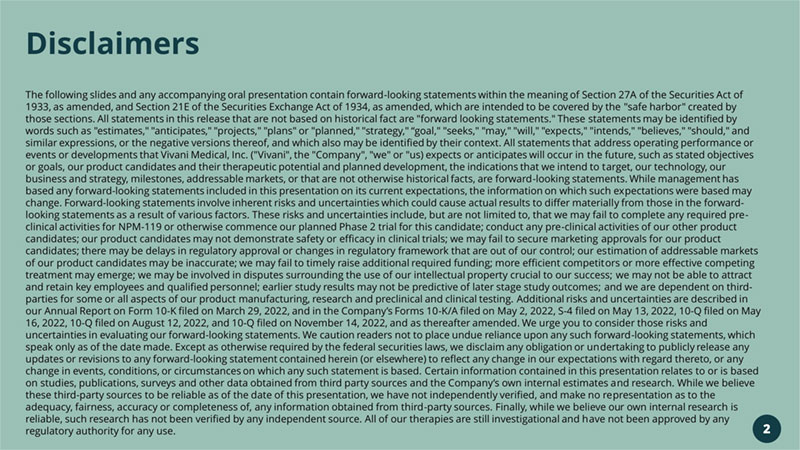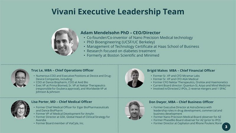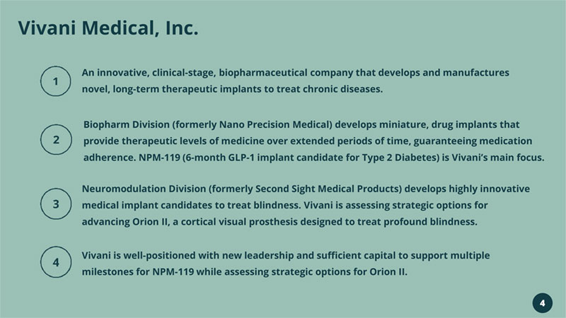 Disclaimers The following slides and any accompanying oral presentation contain forward - looking statements within the meaning of Section 27A of the Securities Act of 1933, as amended, and Section 21E of the Securities Exchange Act of 1934, as amended, which are intended to be covered by the "s afe harbor" created by those sections. All statements in this release that are not based on historical fact are "forward looking statements." These sta tements may be identified by words such as "estimates," "anticipates," "projects," "plans" or "planned," "strategy," “goal," "seeks," "may," "will," "expe cts ," "intends," "believes," "should," and similar expressions, or the negative versions thereof, and which also may be identified by their context. All statements that ad dress operating performance or events or developments that Vivani Medical, Inc. ("Vivani", the "Company", "we" or "us) expects or anticipates will occur in the future, such as stated objectives or goals, our product candidates and their therapeutic potential and planned development, the indications that we intend to t arg et, our technology, our business and strategy, milestones, addressable markets, or that are not otherwise historical facts, are forward - looking statemen ts. While management has based any forward - looking statements included in this presentation on its current expectations, the information on which such ex pectations were based may change. Forward - looking statements involve inherent risks and uncertainties which could cause actual results to differ materiall y from those in the forward - looking statements as a result of various factors. These risks and uncertainties include, but are not limited to, that we may fail to complete any required pre - clinical activities for NPM - 119 or otherwise commence our planned Phase 2 trial for this candidate; conduct any pre - clinical act ivities of our other product candidates; our product candidates may not demonstrate safety or efficacy in clinical trials; we may fail to secure marketing ap provals for our product candidates; there may be delays in regulatory approval or changes in regulatory framework that are out of our control; our es tim ation of addressable markets of our product candidates may be inaccurate; we may fail to timely raise additional required funding; more efficient competitors or more effective competing treatment may emerge; we may be involved in disputes surrounding the use of our intellectual property crucial to our success; we may not be able to attract and retain key employees and qualified personnel; earlier study results may not be predictive of later stage study outcomes; and we are dependent on third - parties for some or all aspects of our product manufacturing, research and preclinical and clinical testing. Additional risks and uncertainties are described in our Annual Report on Form 10 - K filed on March 29, 2022, and in the Company’s Forms 10 - K/A filed on May 2, 2022, S - 4 filed on May 13, 2022, 10 - Q filed on May 16, 2022, 10-Q filed on August 12, 2022, and 10-Q filed on November 14, 2022, and as thereafter amended. We urge you to consider those risks and uncertainties in evaluating our forward - looking statements. We caution readers not to place undue reliance upon any such forward - looking statements, which speak only as of the date made. Except as otherwise required by the federal securities laws, we disclaim any obligation or undertaking to publicly release any updat es or revisions to any forward - looking statement contained herein (or elsewhere) to reflect any change in our expectations with regard thereto, or any change i n events, conditions, or circumstances on which any such statement is based. Certain information contained in this presentation relates to or is based on studies, publications, surveys and other data obtained from third party sources and the Company’s own internal estimates and research. While we believe thes e t hird - party sources to be reliable as of the date of this presentation, we have not independently verified, and make no representation as to the adequa cy, fairness, accuracy or completeness of, any information obtained from third - party sources. Finally, while we believe our own internal research is relia ble, such research has not been verified by any independent source. All of our therapies are still investigational and have not been approved by any regulato ry authority for any use. 2