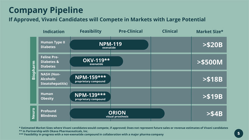 Vivani Medical, Inc. B iopharm Division (formerly Nano Precision Medical) develops miniature, drug implants that provide therapeutic levels of medicine over extended periods of time, guaranteeing medication adherence. NPM - 119 (6 - month GLP - 1 implant candidate for Type 2 Diabetes) is Vivani’s main focus. Neuromodulation Division (formerly Second Sight Medical Products) develops highly innovative medical implant candidates to treat blindness. Vivani is assessing strategic options for advancing Orion II, a cortical visual prosthesis designed to treat profound blindness. An innovative, clinical - stage, biopharmaceutical company that develops and manufactures novel, long - term therapeutic implants to treat chronic diseases. Vivani is well - positioned with new leadership and sufficient capital to support multiple milestones for NPM - 119 while assessing strategic options for Orion II. 4