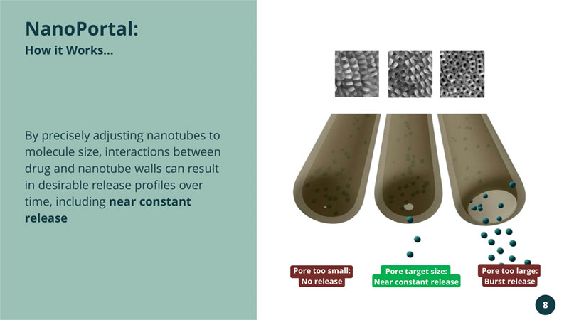 By precisely adjusting nanotubes to molecule size, interactions between drug and nanotube walls can result in desirable release profiles over time, including near constant release NanoPortal : How it Works... Pore too small: No release Pore target size: Near constant release Pore too large: Burst release 8