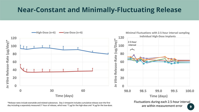 0 20 40 60 80 100 120 98.0 98.5 99.0 99.5 100.0 In Vitro Release - Rate (ug/Day)* Time (days) Minimal Fluctuations with 2.5 - hour interval sampling Individual High - Dose Implants Near - Constant and Minimally - Fluctuating Release *Release - rates include exenatide and related substances. Day 1 timepoint includes cumulative release over the first day including a separately measured 1 st hour of release, which was ~7 µg for the high - dose and ~4 µg for the low - dose. 0 20 40 60 80 100 120 0 30 60 In Vitro Release - Rate ( µ g/day)* Time (days) High-Dose (n=6) Low-Dose (n=6) 9 Fluctuations during each 2.5 - hour interval are within measurement error 2.5 - hour interval