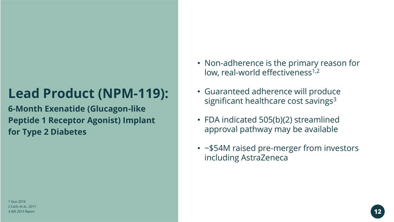 1 Guo 2016 2 Carls et al., 2017 3 IMS 2013 Report • Non - adherence is the primary reason for low, real - world effectiveness 1,2 • Guaranteed adherence will produce significant healthcare cost savings 3 • FDA indicated 505(b)(2) streamlined approval pathway may be available • ~$54M raised pre - merger from investors including AstraZeneca 6 - Month Exenatide (Glucagon - like Peptide 1 Receptor Agonist) Implant for Type 2 Diabetes Lead Product (NPM - 119): 12