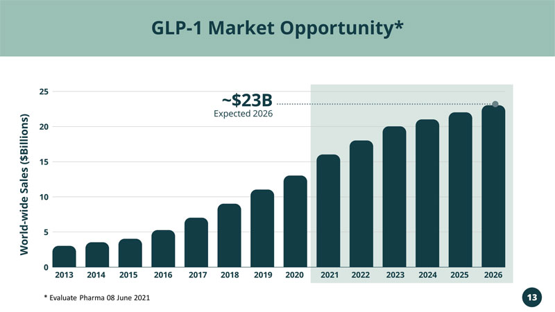 2013 2014 2015 2016 2017 2018 2019 2020 2021 2022 2023 2024 2025 2026 25 20 15 10 5 0 Expected 2026 ~$23B GLP - 1 Market Opportunity* World - wide Sales ($Billions) * Evaluate Pharma 08 June 2021 13