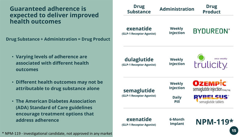 Januvia Trulicity Invokana NPM - 119* 100% 75% 50% 25% 0% DPP - 4 inhibitors, daily pills Polonsky et al.,2016 GLP - 1 weekly injections Modyet al., 2018 SGLT - 2 daily pills Cai et al., 2017 GLP - 1 implant every 6 months • Orals and injectables do not guarantee adherence • Approximately 50% of patients do not meet glycemic targets primarily due to adherence NPM - 119 Designed to Enable 100% Adherence through Implant Duration Dual Incentive to Adopt Technology that Improves Adherence • Pharmaceutical revenue is increased • Healthcare costs are decreased Current Drug Adherence Challenge " Drugs don't work in people that don't take them" Real - world Adherence * NPM - 119 - investigational candidate, not approved in any market * NPM - 119 designed to enable 100% adherence. Real - World Adherence of Select Drugs 14
