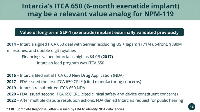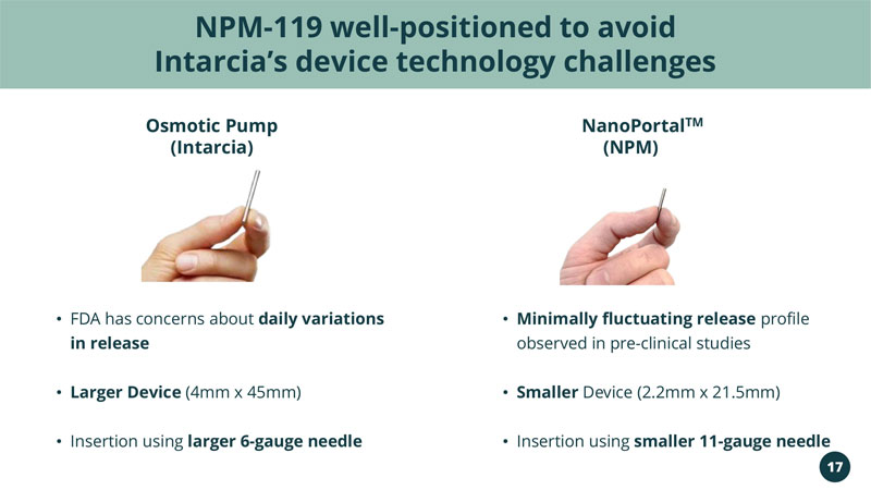Intarcia’s ITCA 650 (6 - month exenatide implant) may be a relevant value analog for NPM - 119 2014 – Intarcia signed ITCA 650 deal with Servier (excluding US + Japan) $171M up - front, $880M milestones, and double - digit royalties Financings valued Intarcia as high as $4.0B (2017) Intarcia’s lead program was ITCA 650 2016 – Intarcia filed initial ITCA 650 New Drug Application (NDA) 2017 – FDA issued the first ITCA 650 CRL* (cited manufacturing concerns) 2019 – Intarcia re - submitted ITCA 650 NDA 2020 – FDA issued second ITCA 650 CRL (cited clinical safety and device constituent concerns) 2022 – After multiple dispute resolution actions, FDA denied Intarcia’s request for public hearing Value of long - term GLP - 1 (exenatide) implant externally validated previously * CRL: Complete Response Letter – issued by FDA to identify NDA deficiencies 16