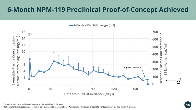 6 - Month NPM - 119 Preclinical Proof - of - Concept Achieved EC 50 * Exenatide antibody - positive animals are not included in this data set. **2 of 6 implants are responsible for higher Day 1 exenatide concentrations. Additional optimization ongoing to yield consis ten t gradual initial PK profiles. Implants removed. ** 0 100 200 300 400 500 600 700 0 2 4 6 8 10 12 14 16 0 30 60 90 120 150 Exenatide Plasma Concentration in 85 kg Human ( pg /mL) Exenatide Plasma Concentration Normalized to 250g Rats (ng/mL) Time from initial initiation (days) 6-Month NPM-119 Prototype (n=6) 18