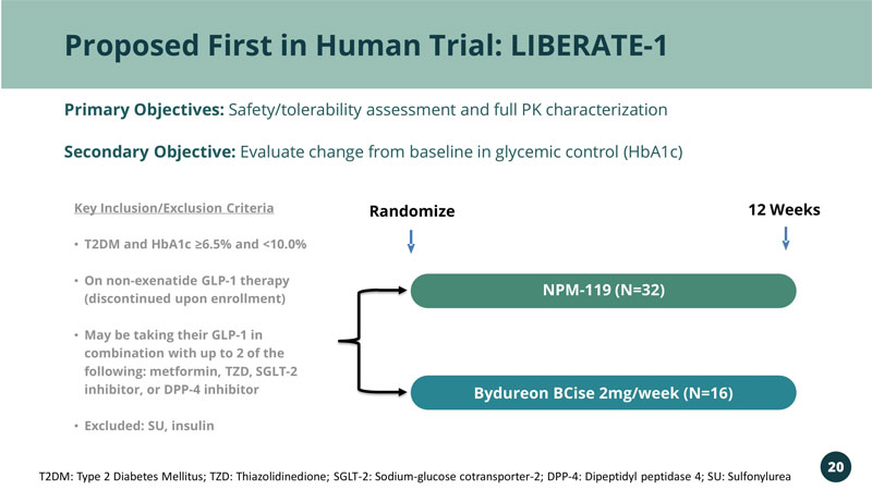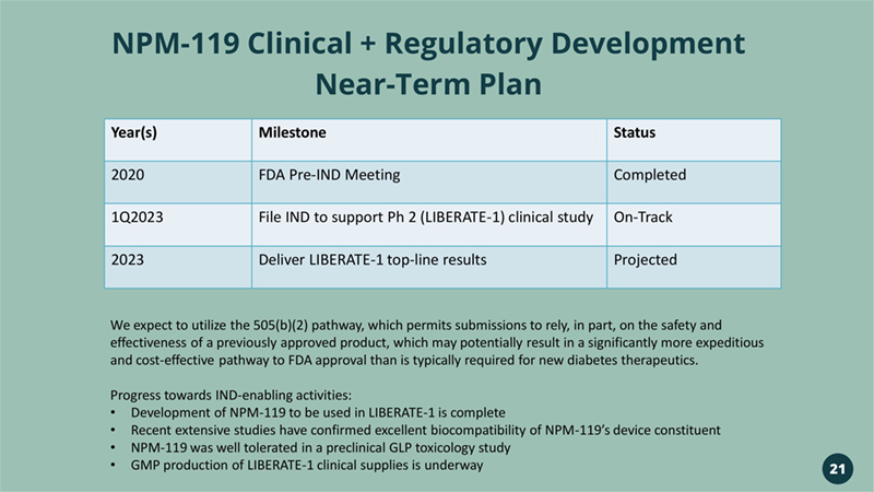 NPM - 119 Clinical + Regulatory Development Near - Term Plan Year(s) Milestone Status 2020 FDA Pre - IND Meeting Completed 1Q2023 File IND to support Ph 2 (LIBERATE - 1) clinical study On - Track 2023 Deliver LIBERATE - 1 top - line results Projected We expect to utilize the 505(b)(2) pathway, which permits submissions to rely, in part, on the safety and effectiveness of a previously approved product, which may potentially result in a significantly more expeditious and cost - effective pathway to FDA approval than is typically required for new diabetes therapeutics. Progress towards IND - enabling activities: • Development of NPM - 119 to be used in LIBERATE - 1 is complete • Recent extensive studies have confirmed excellent biocompatibility of NPM - 119’s device constituent • NPM - 119 was well tolerated in a preclinical GLP toxicology study • GMP production of LIBERATE - 1 clinical supplies is underway 21