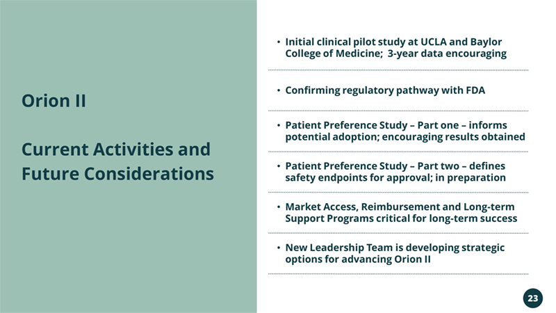 Orion II Current Activities and Future Considerations • Initial clinical pilot study at UCLA and Baylor College of Medicine; 3 - year data encouraging • Confirming regulatory pathway with FDA • Patient Preference Study – Part one – informs potential adoption; encouraging results obtained • Market Access, Reimbursement and Long - term Support Programs critical for long - term success • Patient Preference Study – Part two – defines safety endpoints for approval; in preparation • New Leadership Team is developing strategic options for advancing Orion II 23