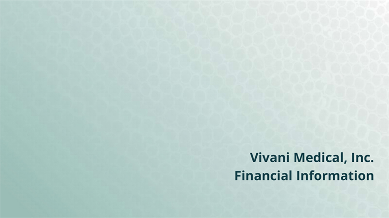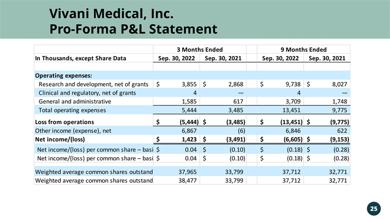 Vivani Medical, Inc. Pro - Forma P&L Statement In Thousands, except Share Data Sep. 30, 2022 Sep. 30, 2021 Sep. 30, 2022 Sep. 30, 2021 Operating expenses: Research and development, net of grants 3,855$ 2,868$ 9,738$ 8,027$ Clinical and regulatory, net of grants 4 — 4 — General and administrative 1,585 617 3,709 1,748 Total operating expenses 5,444 3,485 13,451 9,775 Loss from operations (5,444)$ (3,485)$ (13,451)$ (9,775)$ Other income (expense), net 6,867 (6) 6,846 622 Net income/(loss) 1,423$ (3,491)$ (6,605)$ (9,153)$ Net income/(loss) per common share – basic and diluted0.04$ (0.10)$ (0.18)$ (0.28)$ Net income/(loss) per common share – basic and diluted0.04$ (0.10)$ (0.18)$ (0.28)$ Weighted average common shares outstanding – basic and diluted37,965 33,799 37,712 32,771 Weighted average common shares outstanding – basic and diluted 38,477 33,799 37,712 32,771 3 Months Ended 9 Months Ended 25