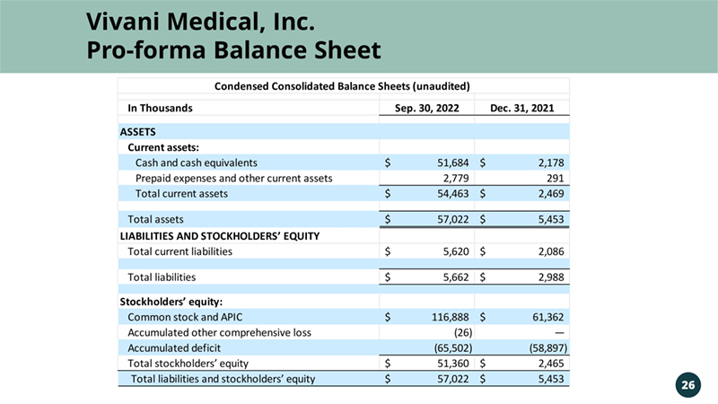 Vivani Medical, Inc. Vivani Medical, Inc. Pro - forma Balance Sheet In Thousands Sep. 30, 2022 Dec. 31, 2021 ASSETS Current assets: Cash and cash equivalents 51,684$ 2,178$ Prepaid expenses and other current assets 2,779 291 Total current assets 54,463$ 2,469$ Total assets 57,022$ 5,453$ LIABILITIES AND STOCKHOLDERS’ EQUITY Total current liabilities 5,620$ 2,086$ Total liabilities 5,662$ 2,988$ Stockholders’ equity: Common stock and APIC 116,888$ 61,362$ Accumulated other comprehensive loss (26) — Accumulated deficit (65,502) (58,897) Total stockholders’ equity 51,360$ 2,465$ Total liabilities and stockholders’ equity 57,022$ 5,453$ Condensed Consolidated Balance Sheets (unaudited) 26