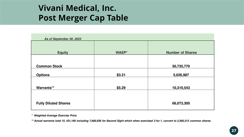 Vivani Medical, Inc. Post Merger Cap Table As of September 30, 2022 Equity WAEP* Number of Shares Common Stock 50,735,770 Options $3.21 5,026,987 Warrants** $5.29 10,310,543 Fully Diluted Shares 66,073,300 * Weighted Average Exercise Price ** Actual warrants total 15, 431,169 including 7,680,938 for Second Sight which when exercised 3 for 1, convert to 2,560,313 com mon shares 27