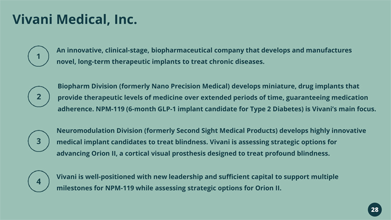 Vivani Medical, Inc. Biopharm Division (formerly Nano Precision Medical) develops miniature, drug implants that provide therapeutic levels of medicine over extended periods of time, guaranteeing medication adherence. NPM - 119 (6 - month GLP - 1 implant candidate for Type 2 Diabetes) is Vivani’s main focus. Neuromodulation Division (formerly Second Sight Medical Products) develops highly innovative medical implant candidates to treat blindness. Vivani is assessing strategic options for advancing Orion II, a cortical visual prosthesis designed to treat profound blindness. An innovative, clinical - stage, biopharmaceutical company that develops and manufactures novel, long - term therapeutic implants to treat chronic diseases. Vivani is well - positioned with new leadership and sufficient capital to support multiple milestones for NPM - 119 while assessing strategic options for Orion II. 28