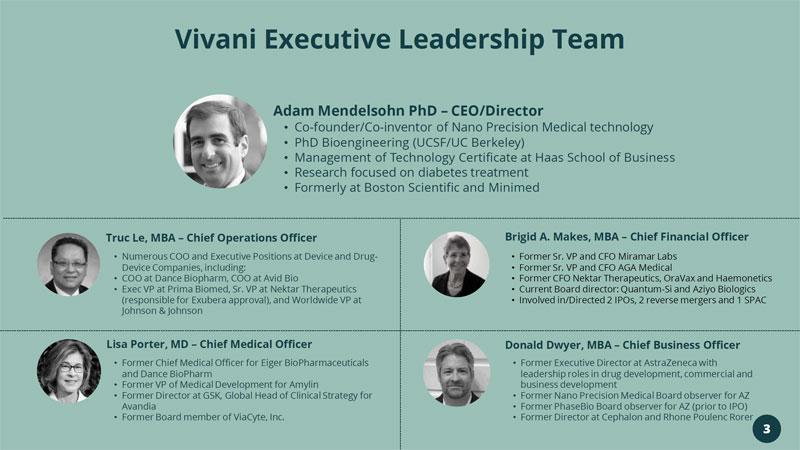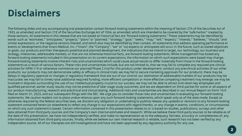 Disclaimers The following slides and any accompanying oral presentation contain forward -looking statements within the meaning of Section 27A of the Securities Act of 1933, as amended, and Section 21E of the Securities Exchange Act of 1934, as amended, which are intended to be covered by the "safe harbor" created by those sections. All statements in this release that are not based on historical fact are "forward looking statements." These statements may be identified by words such as "estimates," "anticipates," "projects," "plans" or "planned," "strategy," “goal," "seeks," "may," "will," "expe cts," "intends," "believes," "should," and similar expressions, or the negative versions thereof, and which also may be identified by their context. All statements that address operating performance or events or developments that Vivani Medical, Inc. ("Vivani", the "Company", "we" or "us) expects or anticipates will occur in thefuture, such as stated objectives or goals, our products and their therapeutic potential and planned development, the indications that we intend to target, our technology, our business and strategy, milestones, addressable markets, or that are not otherwise historical facts, are forward -looking statements. While man agement has based any forward-looking statements included in this presentation on its current expectations, the information on which such expectations were based may change. Forward-looking statements involve inherent risks and uncertainties which could cause actual results to differ materially from t hose in the forward -looking statements as a result of various factors. These risks and uncertainties include, but are not limited to, that we may fail to complete any required pre -clinical activities for NPM-119 or otherwise commence our planned Phase 2 trial for this product under development; conduct any pre -clinical activities of our other products; our products may not demonstrate safety or efficacy in clinical trials; we may fail to secure marketing approvals f or our products; there may be delays in regulatory approval or changes in regulatory framework that are out of our control; our estimation of addressable m arkets of our products may be inaccurate; we may fail to timely raise additional required funding; more efficient competitors or more effective competing t reatment may emerge; we may be involved in disputes surrounding the use of our intellectual property crucial to our success; we may not be able to attract a nd retain key employees and qualified personnel; earlier study results may not be predictive of later stage study outcomes; and we are dependent on third -parties for some or all aspects of our product manufacturing, research and preclinical and clinical testing. Additional risks and uncertainties are described in our Annual Report on Form 10 -K filed on March 31, 2023, and our subsequent filings with the SEC. We urge you to consider those risks and uncertainties in ev aluating our forward -looking statements. We caution readers not to place undue reliance upon any such forward -looking statements, which speak only as of the date made. Except as otherwise required by the federal securities laws, we disclaim any obligation or undertaking to publicly release any updates or revisions to any forward-looking statement contained herein (or elsewhere) to reflect any change in our expectations with regard thereto, or any change in eve nts, conditions, or circumstances on which any such statement is based. Certain information contained in this presentation relates to or is based on studies, publications, surveys and other data obtained from third party sources and the Company’s own internal estimates and research. While we believe these third -party sources to be reliable as of the date of this presentation, we have not independently verified, and make no representation as to the adequacy, fairness, a ccuracy or completeness of, any information obtained from third -party sources. Finally, while we believe our own internal research is reliable, such research ha s not been verified by any independent source. All of our therapies are still investigational and have not been approved by any regulatory authority for any use. 2
