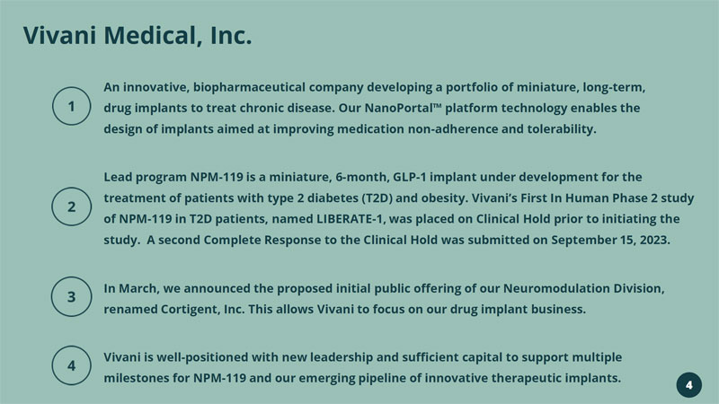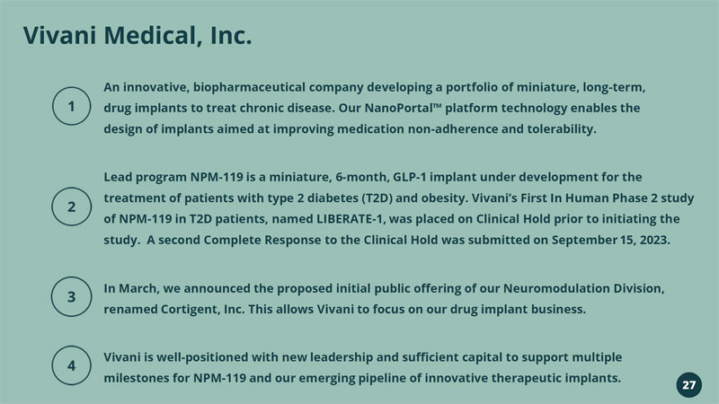 Vivani Medical, Inc. Lead program NPM -119 is a miniature, 6 -month, GLP -1 implant under development for the treatment of patients with type 2 diabetes (T2D) and obesity. Vivani’s First In Human Phase 2 study of NPM-119 in T2D patients, named LIBERATE -1, was placed on Clinical Hold prior to initiating the study. A second Complete Response to the Clinical Hold was submitted on September 15, 2023. In March, we announced the proposed initial public offering of our Neuromodulation Division, renamed Cortigent, Inc. This allows Vivani to focus on our drug implant business. An innovative, biopharmaceutical company developing a portfolio of miniature, long -term, drug implants to treat chronic disease. Our NanoPortal ™ platform technology enables the design of implants aimed at improving medication non -adherence and tolerability. Vivani is well -positioned with new leadership and sufficient capital to support multiple milestones for NPM -119 and our emerging pipeline of innovative therapeutic implants. 27