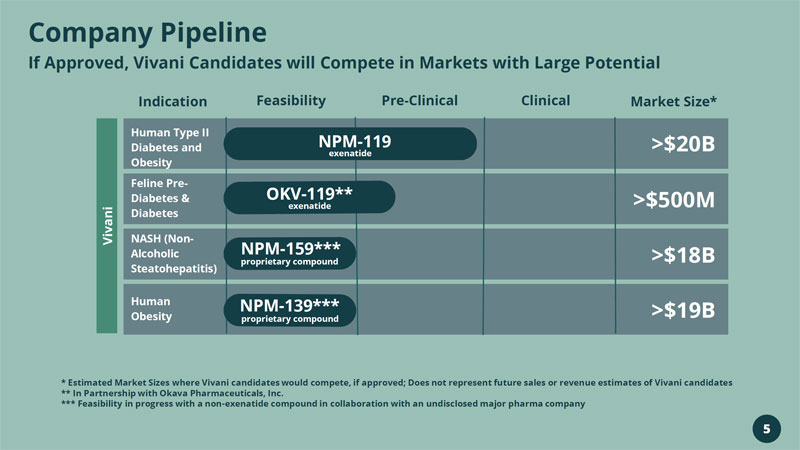 Vivani Medical, Inc. Lead program NPM -119 is a miniature, 6 -month, GLP -1 implant under development for the treatment of patients with type 2 diabetes (T2D) and obesity. Vivani’s First In Human Phase 2 study of NPM-119 in T2D patients, named LIBERATE -1, was placed on Clinical Hold prior to initiating the study. A second Complete Response to the Clinical Hold was submitted on September 15, 2023. In March, we announced the proposed initial public offering of our Neuromodulation Division, renamed Cortigent, Inc. This allows Vivani to focus on our drug implant business. An innovative, biopharmaceutical company developing a portfolio of miniature, long -term, drug implants to treat chronic disease. Our NanoPortal ™ platform technology enables the design of implants aimed at improving medication non -adherence and tolerability. Vivani is well -positioned with new leadership and sufficient capital to support multiple milestones for NPM -119 and our emerging pipeline of innovative therapeutic implants. 4