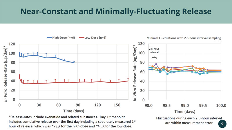 0 20 40 60 80 100 120 98.0 98.5 99.0 99.5 100.0 I n V i t r o R e l e a s e - R a t e ( u g / D a y ) * Time (days) Minimal Fluctuations with 2.5-hour interval sampling Near-Constant and Minimally -Fluctuating Release *Release-rates include exenatide and related substances. Day 1 timepoint includes cumulative release over the first day including a separately measured 1 st hour of release, which was ~7 µg for the high-dose and ~4 µg for the low-dose. Fluctuations during each 2.5-hour interval are within measurement error 2.5-hour interval 0 20 40 60 80 100 120 0 30 60 90 120 150 I n V i t r o R e l e a s e - R a t e ( µ g / d a y ) * Time (days) High-Dose (n=6) Low-Dose (n=6) 9