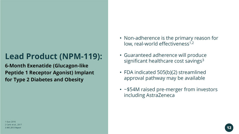 1 Guo 2016 2 Carls et al., 2017 3 IMS 2013 Report • Non-adherence is the primary reason for low, real-world effectiveness 1,2 • Guaranteed adherence will produce significant healthcare cost savings 3 • FDA indicated 505(b)(2) streamlined approval pathway may be available • ~$54M raised pre-merger from investors including AstraZeneca 6-Month Exenatide (Glucagon -like Peptide 1 Receptor Agonist) Implant for Type 2 Diabetes and Obesity Lead Product (NPM -119): 12