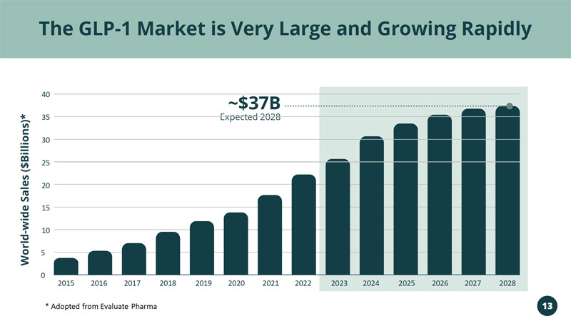 2015 2016 2017 2018 2019 2020 2021 2022 2023 2024 2025 2026 2027 2028 40 20 15 10 5 0 Expected 2028 ~$37B The GLP-1 Market is Very Large and Growing Rapidly W o r l d - w i d e S a l e s ( $ B i l l i o n s ) * * Adopted from Evaluate Pharma 13 35 30 25