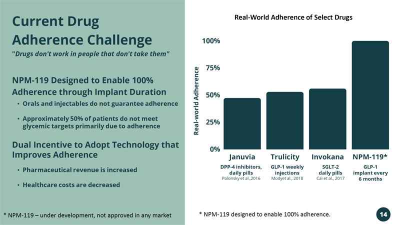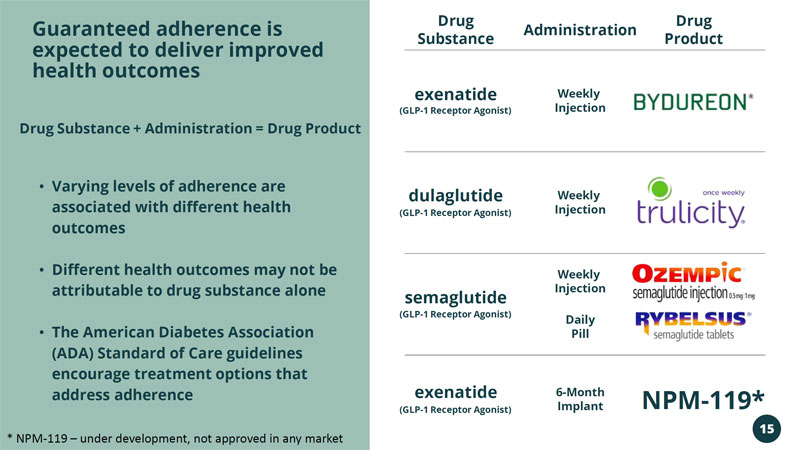 Januvia Trulicity Invokana NPM-119* 100% 75% 50% 25% 0% DPP-4 inhibitors, daily pills Polonsky et al.,2016 GLP-1 weekly injections Modyet al., 2018 SGLT-2 daily pills Cai et al., 2017 GLP-1 implant every 6 months • Orals and injectables do not guarantee adherence • Approximately 50% of patients do not meet glycemic targets primarily due to adherence NPM-119 Designed to Enable 100% Adherence through Implant Duration Dual Incentive to Adopt Technology that Improves Adherence • Pharmaceutical revenue is increased • Healthcare costs are decreased Current Drug Adherence Challenge "Drugs don't work in people that don't take them" R e a l - w o r l d A d h e r e n c e * NPM-119 –under development, not approved in any market * NPM-119 designed to enable 100% adherence. Real-World Adherence of Select Drugs 14