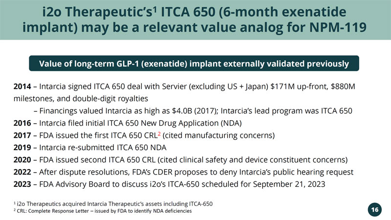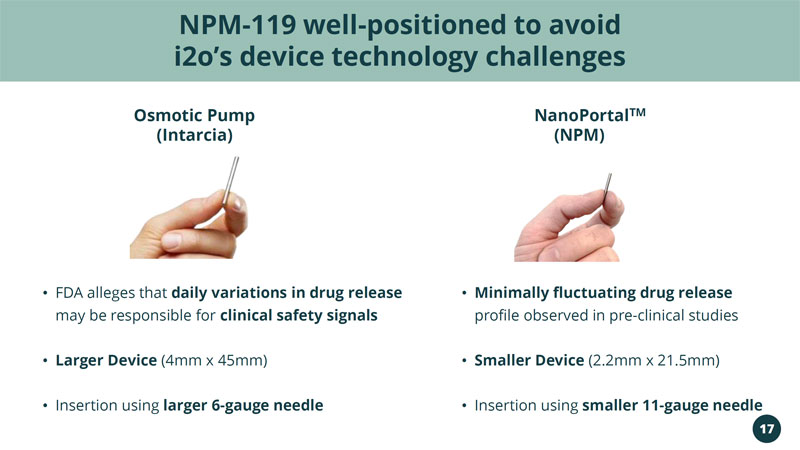 i2o Therapeutic’s 1 ITCA 650 (6-month exenatide implant) may be a relevant value analog for NPM -119 2014–Intarcia signed ITCA 650 deal with Servier(excluding US + Japan) $171M up-front, $880M milestones, and double -digit royalties –Financings valued Intarcia as high as $4.0B (2017); Intarcia’s lead program was ITCA 650 2016–Intarcia filed initial ITCA 650 New Drug Application (NDA) 2017–FDA issued the first ITCA 650 CRL 2 (cited manufacturing concerns) 2019–Intarcia re-submitted ITCA 650 NDA 2020–FDA issued second ITCA 650 CRL (cited clinical safety and device constituent concerns) 2022–After dispute resolutions, FDA’s CDER proposes to deny Intarcia’s public hearing request 2023–FDA Advisory Board to discuss i2o’s ITCA-650 scheduled for September 21, 2023 Value of long -term GLP-1 (exenatide) implant externally validated previously 1 i2o Therapeutics acquired Intarcia Therapeutic’s assets including ITCA -650 2 CRL: Complete Response Letter –issued by FDA to identify NDA deficiencies 16