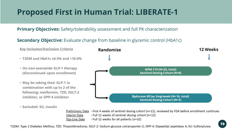 Proposed First in Human Trial: LIBERATE -1 Primary Objectives: Safety/tolerability assessment and full PK characterization Secondary Objective: Evaluate change from baseline in glycemic control (HbA1c) Randomize 12 Weeks Key Inclusion/Exclusion Criteria •T2DM and HbA1c =6.5% and <10.0% •On non-exenatide GLP-1 therapy (discontinued upon enrollment) •May be taking their GLP -1 in combination with up to 2 of the following: metformin, TZD, SGLT-2 inhibitor, or DPP-4 inhibitor •Excluded: SU, insulin NPM-119 (N=32, total) Sentinel Dosing Cohort (N=8) Bydureon BCise2mg/week (N=16, total) Sentinel Dosing Cohort (N=4) T2DM: Type 2 Diabetes Mellitus; TZD: Thiazolidinedione; SGLT-2: Sodium-glucose cotransporter-2; DPP-4: Dipeptidyl peptidase 4; SU: Sulfonylurea 19 Preliminary Data Interim Data Top-Line Data -First 4 weeks of sentinel dosing cohort (n=12), reviewed by FDA before enrollment continues -Full 12 weeks of sentinel dosing cohort (n=12) -Full 12 weeks for all patients (n=32)