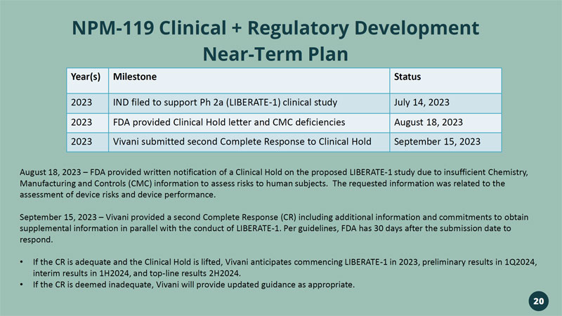 NPM-119 Clinical + Regulatory Development Near-Term Plan Year(s) Milestone Status 2023 IND filed to support Ph 2a (LIBERATE-1) clinical study July 14, 2023 2023 FDA provided Clinical Hold letter and CMC deficiencies August 18, 2023 2023 Vivani submitted second Complete Response to Clinical Hold September 15, 2023 August 18, 2023 –FDA provided written notification of a Clinical Hold on the proposed LIBERATE-1 study due to insufficient Chemistry, Manufacturing and Controls (CMC) information to assess risks to human subjects. The requested information was related to the assessment of device risks and device performance. September 15, 2023 –Vivani provided a second Complete Response (CR) including additional information and commitments to obtain supplemental information in parallel with the conduct of LIBERATE-1. Per guidelines, FDA has 30 days after the submission date to respond. • If the CR is adequate and the Clinical Hold is lifted, Vivani anticipates commencing LIBERATE-1 in 2023, preliminary results in 1Q2024, interim results in 1H2024, and top-line results 2H2024. • If the CR is deemed inadequate, Vivani will provide updated guidance as appropriate. 20