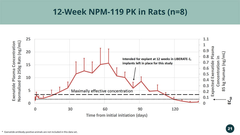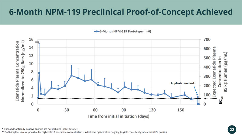 0 0.1 0.2 0.3 0.4 0.5 0.6 0.7 0.8 0.9 1 1.1 0 5 10 15 20 25 0 30 60 90 120 E x p e c t e d E x e n a t i d e P l a s m a C o n c e n t r a t i o n i n 8 5 k g H u m a n ( n g / m L ) E x e n a t i d e P l a s m a C o n c e n t r a t i o n N o r m a l i z e d t o 2 5 0 g R a t s ( n g / m L ) Time from initial initiation (days) 12-Week NPM-119 PK in Rats (n=8) * Exenatide antibody-positive animals are not included in this data set. 21 E C 5 0 Maximally effective concentration Intended for explant at 12 weeks in LIBERATE-1, implants left in place for this study
