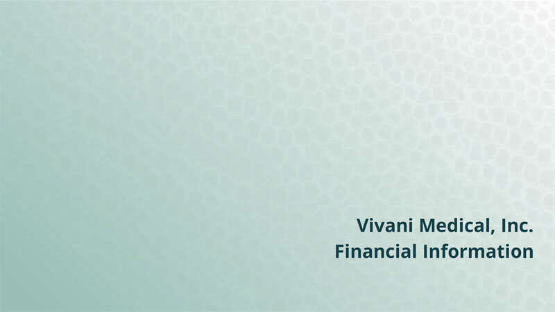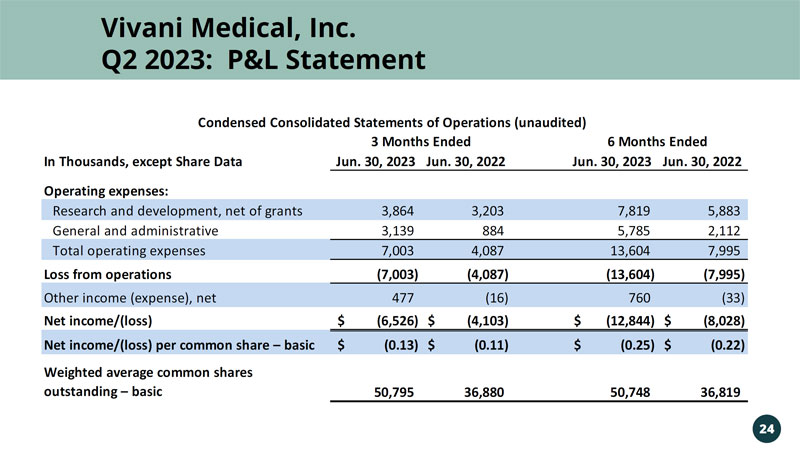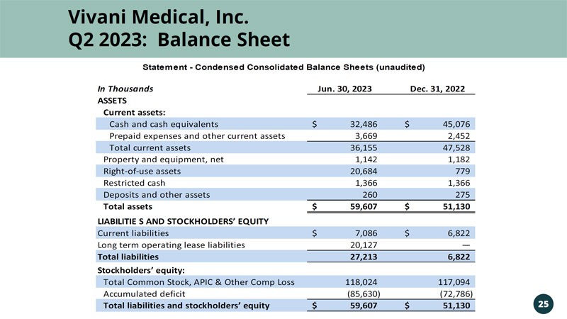 Vivani Medical, Inc. Q2 2023: P&L Statement 24 In Thousands, except Share Data Jun. 30, 2023 Jun. 30, 2022 Jun. 30, 2023 Jun. 30, 2022 Operating expenses: Research and development, net of grants 3,864 3,203 7,819 5,883 General and administrative 3,139 884 5,785 2,112 Total operating expenses 7,003 4,087 13,604 7,995 Loss from operations (7,003) (4,087) (13,604) (7,995) Other income (expense), net 477 (16) 760 (33) Net income/(loss) (6,526)$ (4,103)$ (12,844)$ (8,028)$ Net income/(loss) per common share – basic (0.13)$ (0.11)$ (0.25)$ (0.22)$ Weighted average common shares outstanding – basic 50,795 36,880 50,748 36,819 3 Months Ended 6 Months Ended Condensed Consolidated Statements of Operations (unaudited)