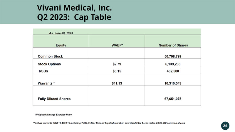 Vivani Medical, Inc. Vivani Medical, Inc. Q2 2023: Balance Sheet 25 In Thousands Jun. 30, 2023 Dec. 31, 2022 ASSETS Current assets: Cash and cash equivalents 32,486$ 45,076$ Prepaid expenses and other current assets 3,669 2,452 Total current assets 36,155 47,528 Property and equipment, net 1,142 1,182 Right-of-use assets 20,684 779 Restricted cash 1,366 1,366 Deposits and other assets 260 275 Total assets 59,607$ 51,130$ LIABILITIE S AND STOCKHOLDERS’ EQUITY Current liabilities 7,086$ 6,822$ Long term operating lease liabilities 20,127 — Total liabilities 27,213 6,822 Stockholders’ equity: Total Common Stock, APIC & Other Comp Loss 118,024 117,094 Accumulated deficit (85,630) (72,786) Total liabilities and stockholders’ equity 59,607$ 51,130$ Statement - Condensed Consolidated Balance Sheets (unaudited)