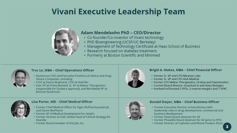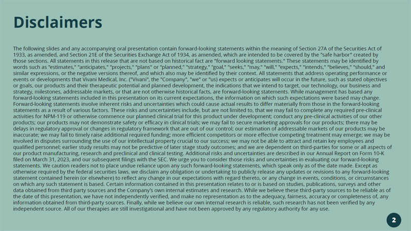 Disclaimers The following slides and any accompanying oral presentation contain forward - looking statements within the meaning of Section 27A of the Securities Act of 1933, as amended, and Section 21E of the Securities Exchange Act of 1934, as amended, which are intended to be covered by the "s afe harbor" created by those sections. All statements in this release that are not based on historical fact are "forward looking statements." These sta tements may be identified by words such as "estimates," "anticipates," "projects," "plans" or "planned," "strategy," “goal," "seeks," "may," "will," "expe cts ," "intends," "believes," "should," and similar expressions, or the negative versions thereof, and which also may be identified by their context. All statements that ad dress operating performance or events or developments that Vivani Medical, Inc. ("Vivani", the "Company", "we" or "us) expects or anticipates will occur in the future, such as stated objectives or goals, our products and their therapeutic potential and planned development, the indications that we intend to target, our te chnology, our business and strategy, milestones, addressable markets, or that are not otherwise historical facts, are forward - looking statements. While man agement has based any forward - looking statements included in this presentation on its current expectations, the information on which such expectations were based may change. Forward - looking statements involve inherent risks and uncertainties which could cause actual results to differ materially from t hose in the forward - looking statements as a result of various factors. These risks and uncertainties include, but are not limited to, that we may fail to complete any required pre - clinical activities for NPM - 119 or otherwise commence our planned clinical trial for this product under development; conduct any pre - clin ical activities of our other products; our products may not demonstrate safety or efficacy in clinical trials; we may fail to secure marketing approvals f or our products; there may be delays in regulatory approval or changes in regulatory framework that are out of our control; our estimation of addressable m ark ets of our products may be inaccurate; we may fail to timely raise additional required funding; more efficient competitors or more effective competing t rea tment may emerge; we may be involved in disputes surrounding the use of our intellectual property crucial to our success; we may not be able to attract a nd retain key employees and qualified personnel; earlier study results may not be predictive of later stage study outcomes; and we are dependent on third - pa rties for some or all aspects of our product manufacturing, research and preclinical and clinical testing. Additional risks and uncertainties are described in ou r Annual Report on Form 10 - K filed on March 31, 2023, and our subsequent filings with the SEC. We urge you to consider those risks and uncertainties in ev alu ating our forward - looking statements. We caution readers not to place undue reliance upon any such forward - looking statements, which speak only as of the date made. Except as otherwise required by the federal securities laws, we disclaim any obligation or undertaking to publicly release any updates or revisions to any fo rward - looking statement contained herein (or elsewhere) to reflect any change in our expectations with regard thereto, or any change in eve nts , conditions, or circumstances on which any such statement is based. Certain information contained in this presentation relates to or is based on studies, publications, surveys and other data obtained from third party sources and the Company’s own internal estimates and research. While we believe these third - party sources to be reliable as of the date of this presentation, we have not independently verified, and make no representation as to the adequacy, fairness, a ccu racy or completeness of, any information obtained from third - party sources. Finally, while we believe our own internal research is reliable, such research ha s not been verified by any independent source. All of our therapies are still investigational and have not been approved by any regulatory authority for an y use. 2