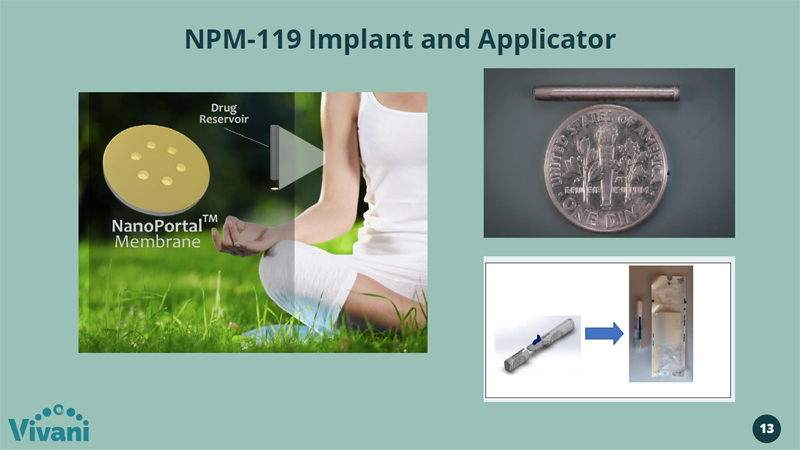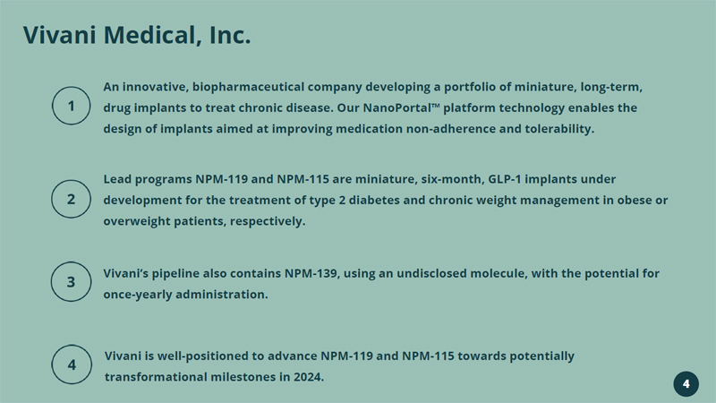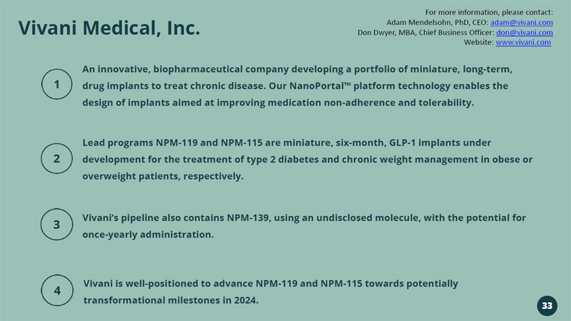 Vivani Medical, Inc. Lead programs NPM - 119 and NPM - 115 are miniature, six - month, GLP - 1 implants under development for the treatment of type 2 diabetes and chronic weight management in obese or overweight patients, respectively. Vivani’s pipeline also contains NPM - 139, using an undisclosed molecule, with the potential for once - yearly administration. An innovative, biopharmaceutical company developing a portfolio of miniature, long - term, drug implants to treat chronic disease. Our NanoPortal ™ platform technology enables the design of implants aimed at improving medication non - adherence and tolerability. Vivani is well - positioned to advance NPM - 119 and NPM - 115 towards potentially transformational milestones in 2024. 33 For more information, please contact: Adam Mendelsohn, PhD, CEO: adam@vivani.com Don Dwyer, MBA, Chief Business Officer: don@vivani.com Website: www.vivani.com