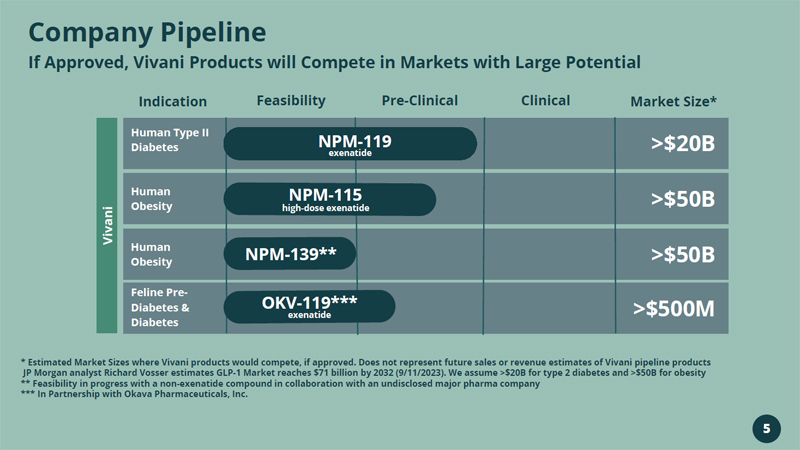 Vivani Medical, Inc. Lead programs NPM - 119 and NPM - 115 are miniature, six - month, GLP - 1 implants under development for the treatment of type 2 diabetes and chronic weight management in obese or overweight patients, respectively. Vivani’s pipeline also contains NPM - 139, using an undisclosed molecule, with the potential for once - yearly administration. An innovative, biopharmaceutical company developing a portfolio of miniature, long - term, drug implants to treat chronic disease. Our NanoPortal ™ platform technology enables the design of implants aimed at improving medication non - adherence and tolerability. Vivani is well - positioned to advance NPM - 119 and NPM - 115 towards potentially transformational milestones in 2024. 4