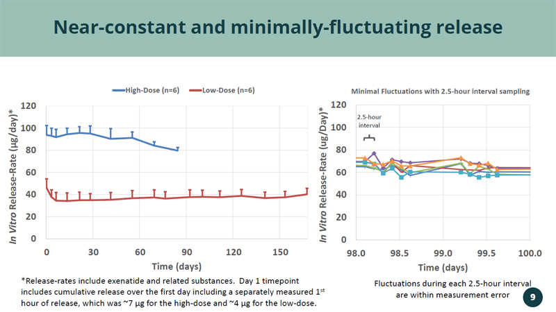 0 20 40 60 80 100 120 98.0 98.5 99.0 99.5 100.0 In Vitro Release - Rate (ug/Day)* Time (days) Minimal Fluctuations with 2.5 - hour interval sampling Near - constant and minimally - fluctuating release *Release - rates include exenatide and related substances. Day 1 timepoint includes cumulative release over the first day including a separately measured 1 st hour of release, which was ~7 µg for the high - dose and ~4 µg for the low - dose. Fluctuations during each 2.5 - hour interval are within measurement error 2.5 - hour interval 0 20 40 60 80 100 120 0 30 60 90 120 150 In Vitro Release - Rate ( µ g/day)* Time (days) High-Dose (n=6) Low-Dose (n=6) 9