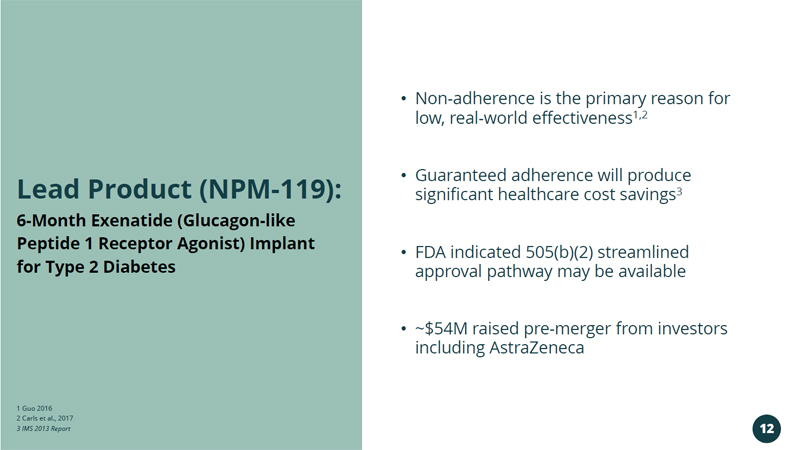 1 Guo 2016 2 Carls et al., 2017 3 IMS 2013 Report • Non - adherence is the primary reason for low, real - world effectiveness 1,2 • Guaranteed adherence will produce significant healthcare cost savings 3 • FDA indicated 505(b)(2) streamlined approval pathway may be available • ~$54M raised pre - merger from investors including AstraZeneca 6 - Month Exenatide (Glucagon - like Peptide 1 Receptor Agonist) Implant for Type 2 Diabetes Lead Product (NPM - 119): 12