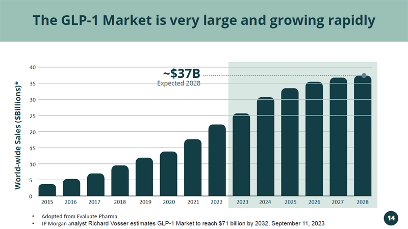 2015 2016 2017 2018 2019 2020 2021 2022 2023 2024 2025 2026 2027 2028 40 20 15 10 5 0 Expected 2028 ~$37B The GLP - 1 Market is very large and growing rapidly World - wide Sales ($Billions)* • Adopted from Evaluate Pharma • JP Morgan a nalyst Richard Vosser estimates GLP - 1 Market to reach $71 billion by 2032, September 11, 2023 14 35 30 25