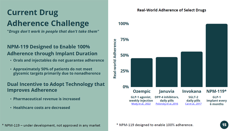 Ozempic Januvia Invokana NPM - 119* 100% 75% 50% 25% 0% GLP - 1 agonist, weekly injection Mody et al., 2022 DPP - 4 inhibitors, daily pills Polonsky et al.,2016 SGLT - 2 daily pills Cai et al., 2017 GLP - 1 implant every 6 months • Orals and injectables do not guarantee adherence • Approximately 50% of patients do not meet glycemic targets primarily due to nonadherence NPM - 119 Designed to Enable 100% Adherence through Implant Duration Dual Incentive to Adopt Technology that Improves Adherence • Pharmaceutical revenue is increased • Healthcare costs are decreased Current Drug Adherence Challenge " Drugs don't work in people that don't take them" Real - world Adherence * NPM - 119 – under development, not approved in any market * NPM - 119 designed to enable 100% adherence. Real - World Adherence of Select Drugs 15