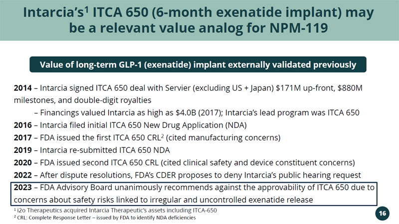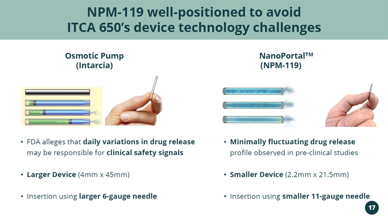Intarcia’s 1 ITCA 650 (6 - month exenatide implant) may be a relevant value analog for NPM - 119 2014 – Intarcia signed ITCA 650 deal with Servier (excluding US + Japan) $171M up - front, $880M milestones, and double - digit royalties – Financings valued Intarcia as high as $4.0B (2017); Intarcia’s lead program was ITCA 650 2016 – Intarcia filed initial ITCA 650 New Drug Application (NDA) 2017 – FDA issued the first ITCA 650 CRL 2 (cited manufacturing concerns) 2019 – Intarcia re - submitted ITCA 650 NDA 2020 – FDA issued second ITCA 650 CRL (cited clinical safety and device constituent concerns) 2022 – After dispute resolutions, FDA’s CDER proposes to deny Intarcia’s public hearing request 2023 – FDA Advisory Board unanimously recommends against the approvability of ITCA 650 due to concerns about safety risks linked to irregular and uncontrolled exenatide release Value of long - term GLP - 1 (exenatide) implant externally validated previously 1 i2o Therapeutics acquired Intarcia Therapeutic’s assets including ITCA - 650 2 CRL: Complete Response Letter – issued by FDA to identify NDA deficiencies 16